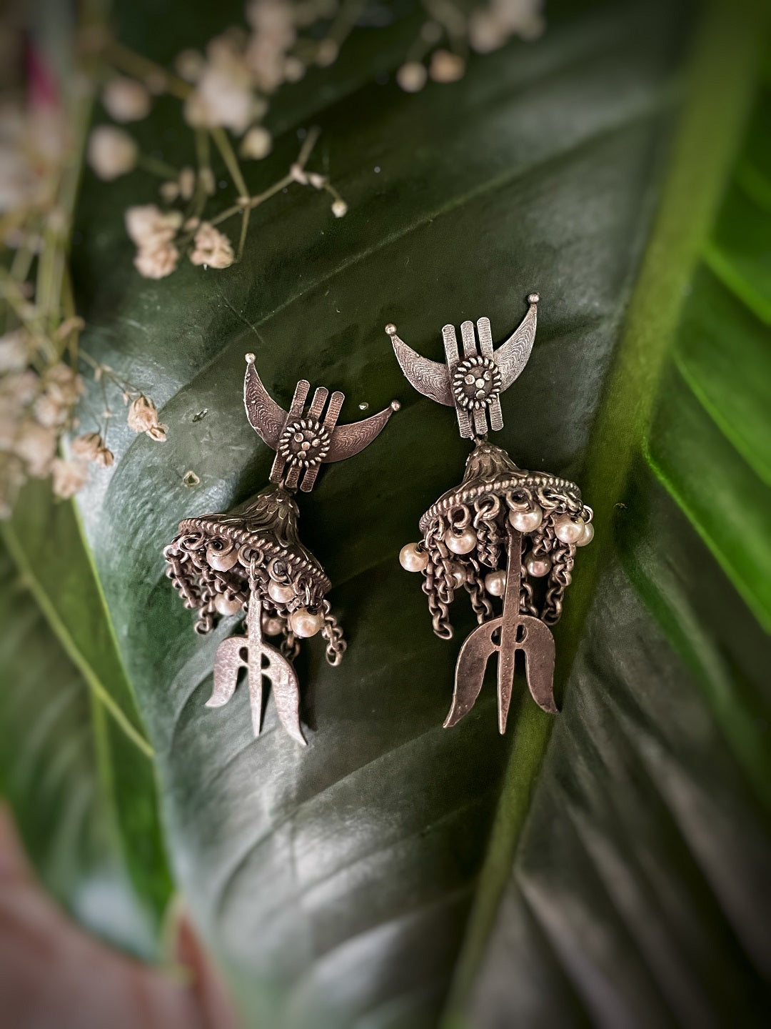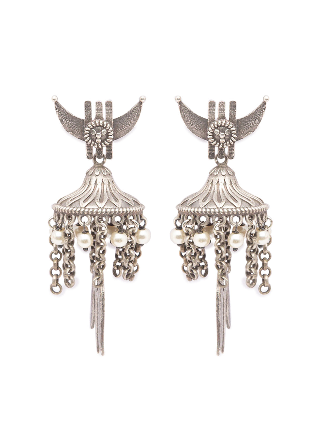 Antique German Silver Oxidized Earrings Chandbali Pearl Jhumkas Tribal Trishul Jhumki Earrings