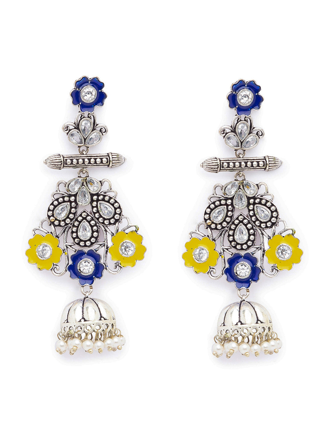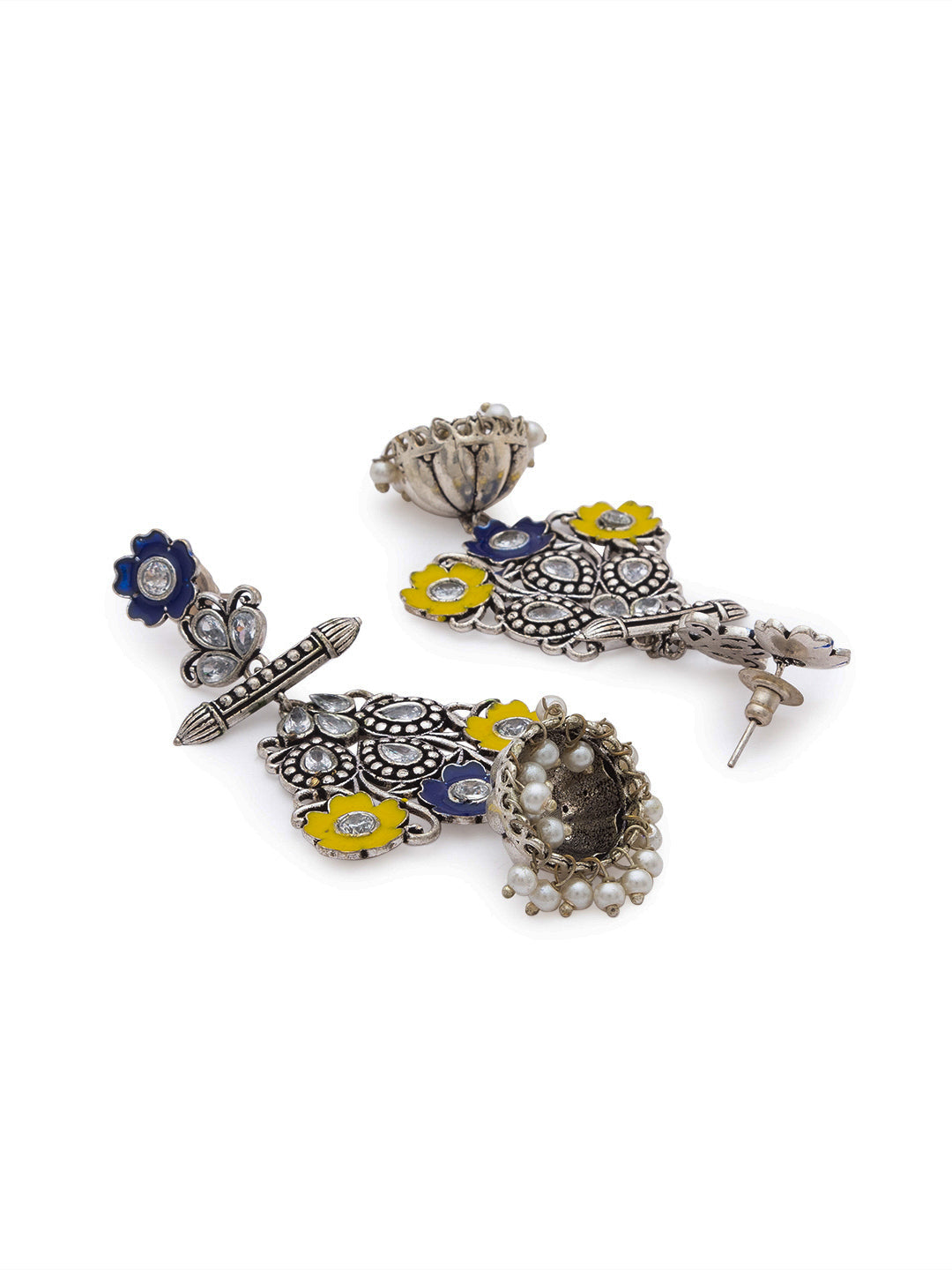 Antique German Silver Oxidized Earrings Floral Design Engraved Stone Studded Pearl Dangler Jhumka