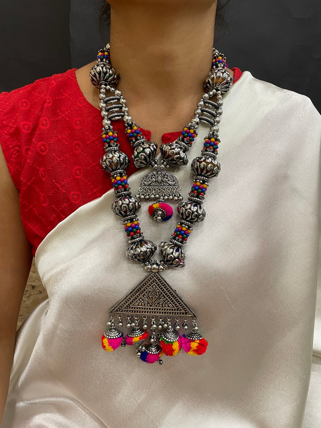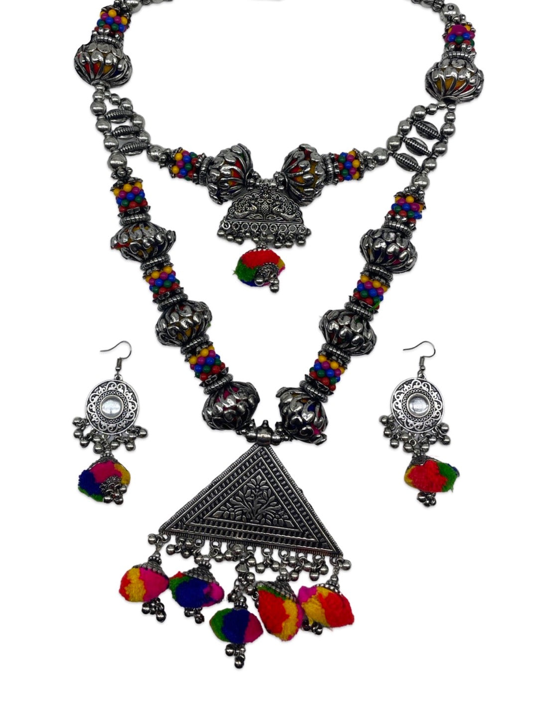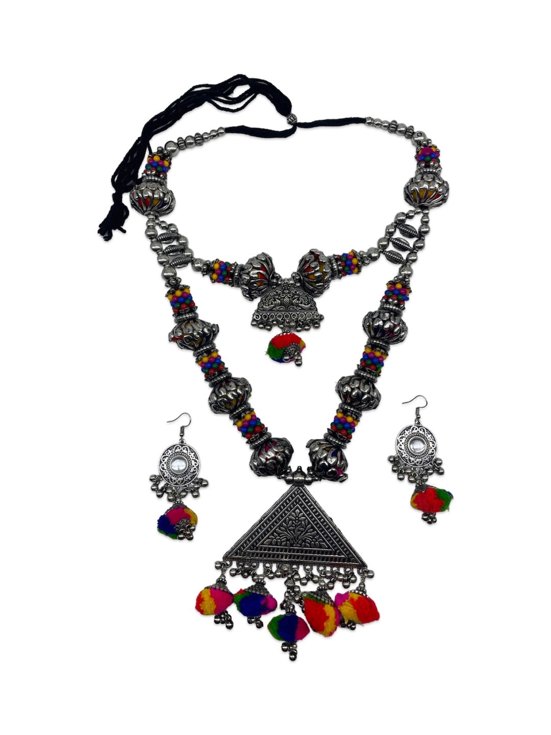 Banjara Necklace Earrings Set Pom Pom/Floral Beaded Layered Jewellery