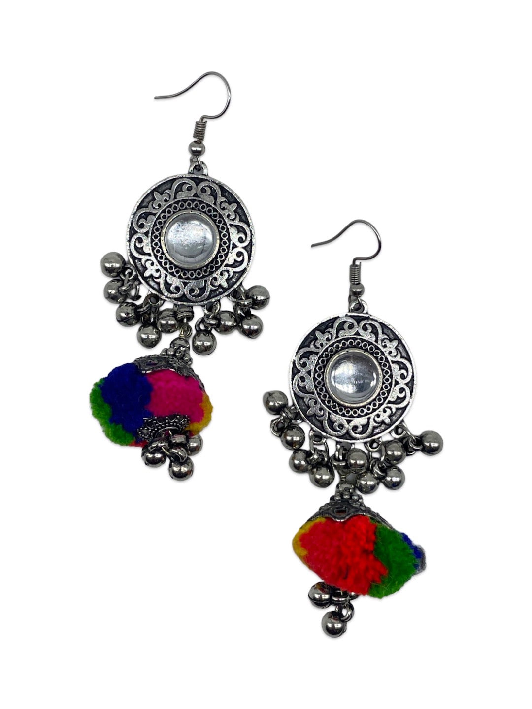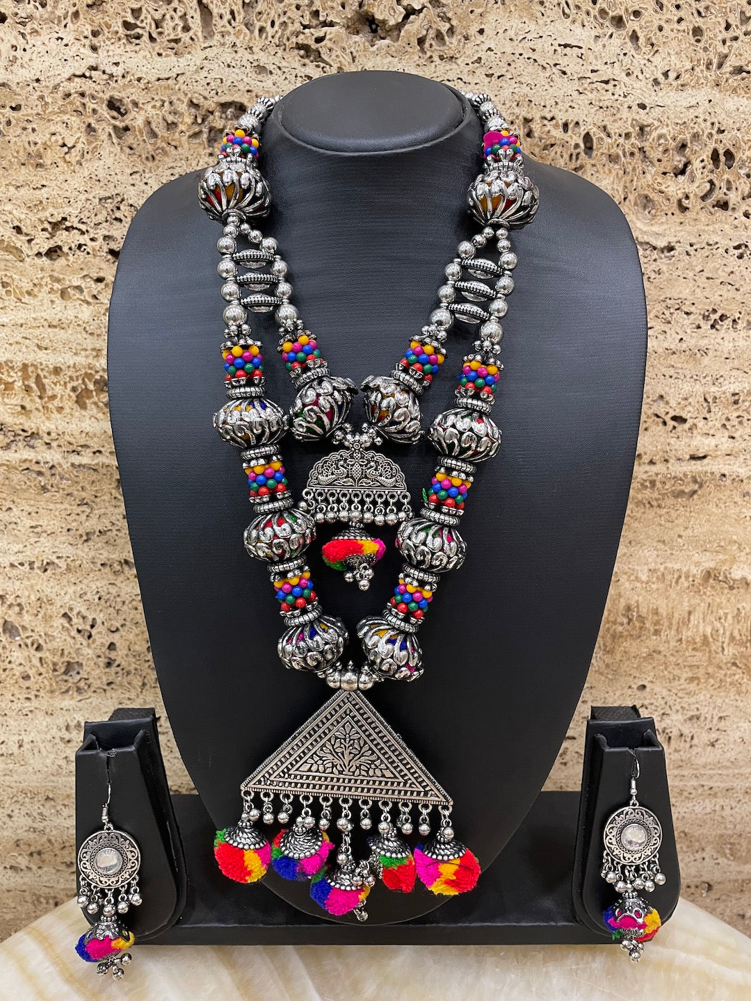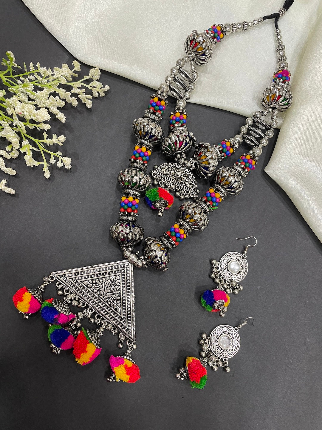 Banjara Necklace Earrings Set Pom Pom/Floral Beaded Layered Jewellery