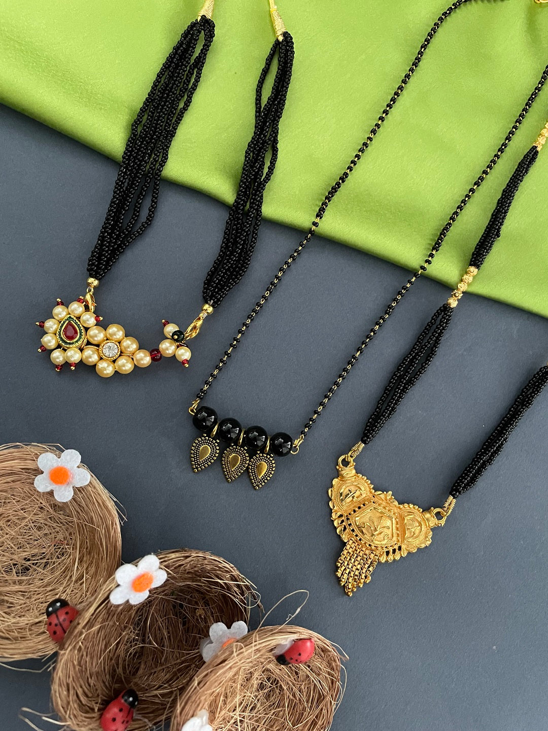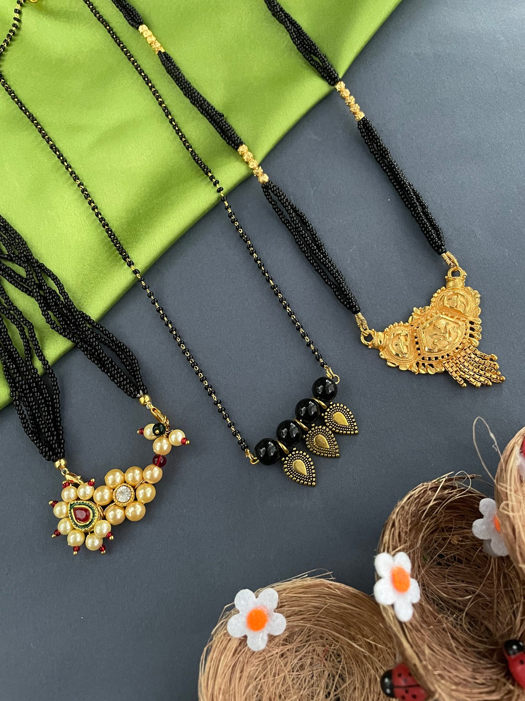 Combo Offer (Set of 3) Gold-Plated Black Beads Short Pearls| Nath Pendant Thushi Mangalsutra | Long Simple Pendant Necklace