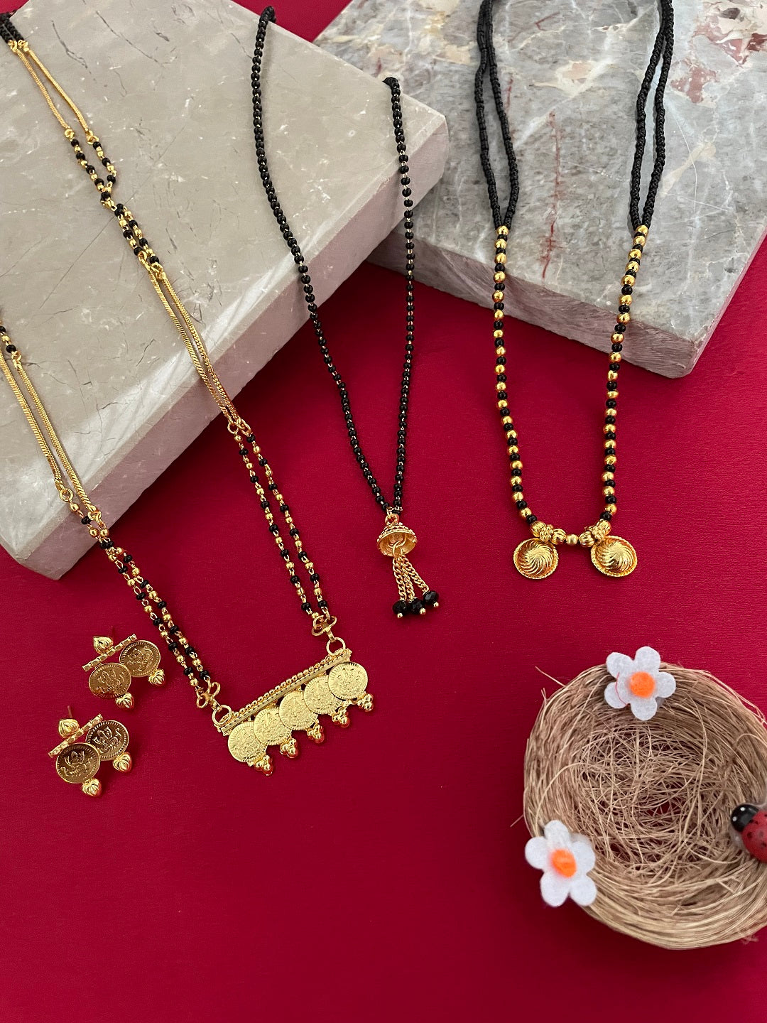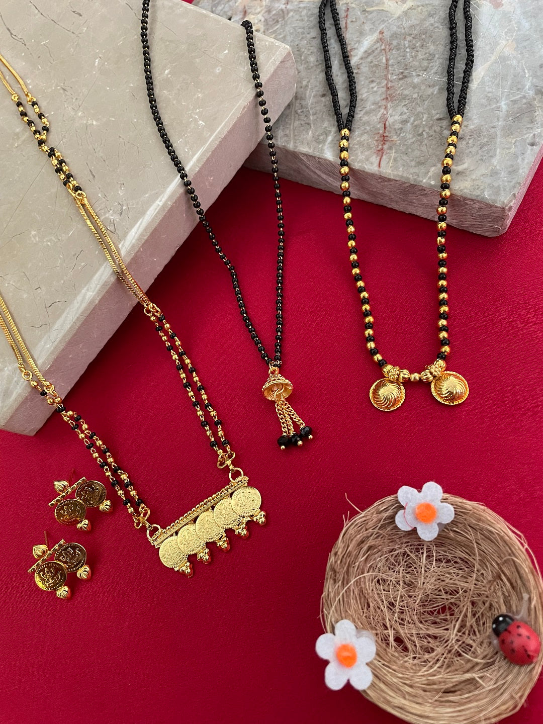 Combo Offer (Set of 3) Gold-Plated Black Beads Short Vati| Latkan Pendant Mangalsutra | Long South Indian Lakshmi Coin Pendant Necklace Set