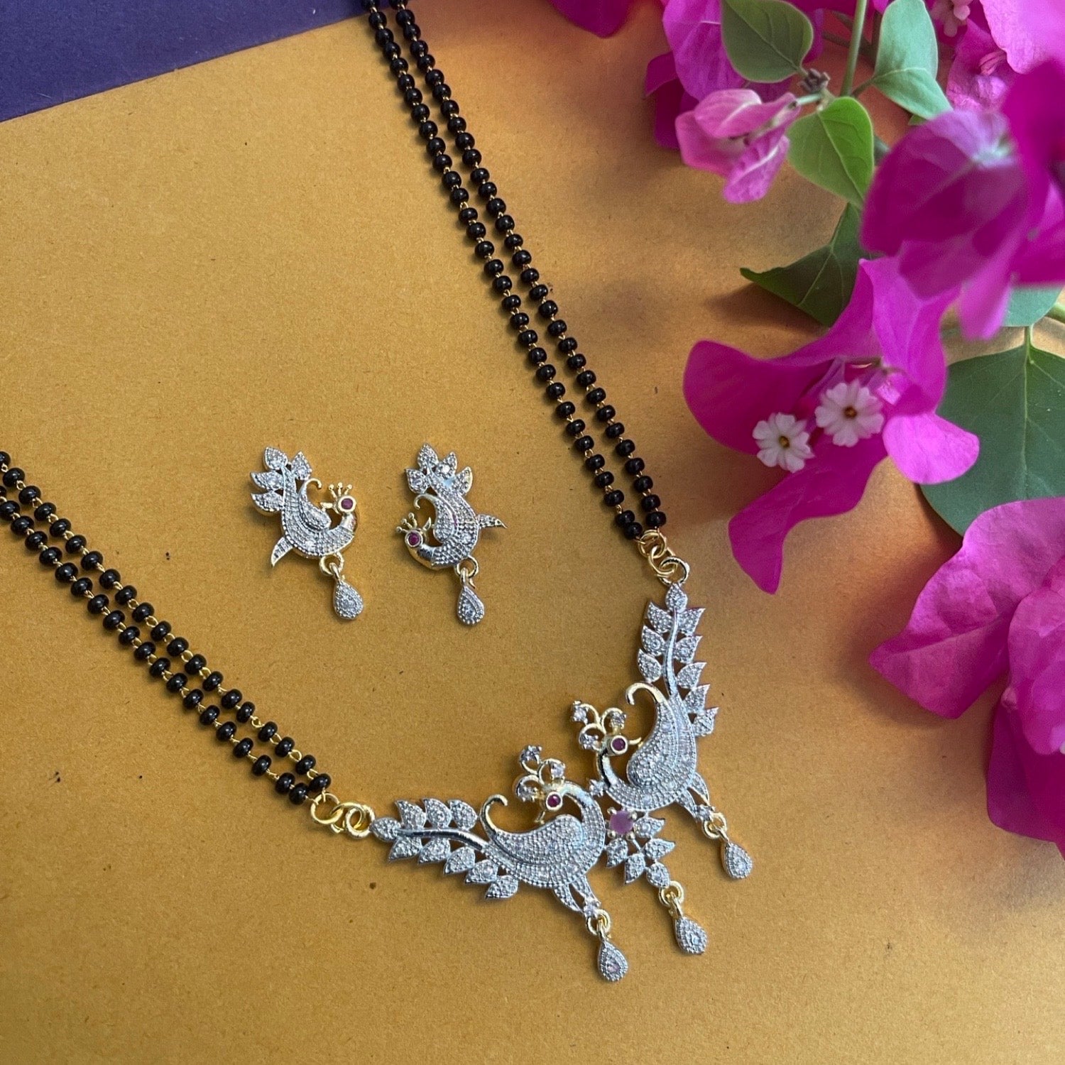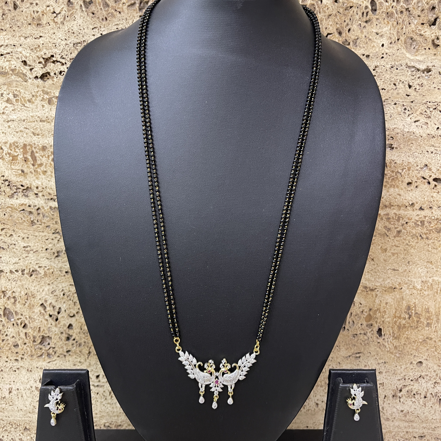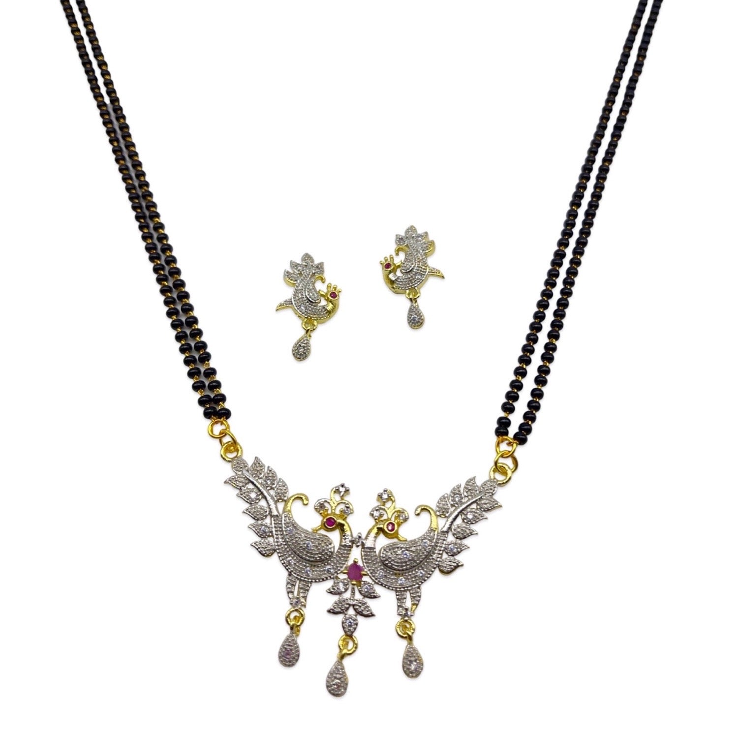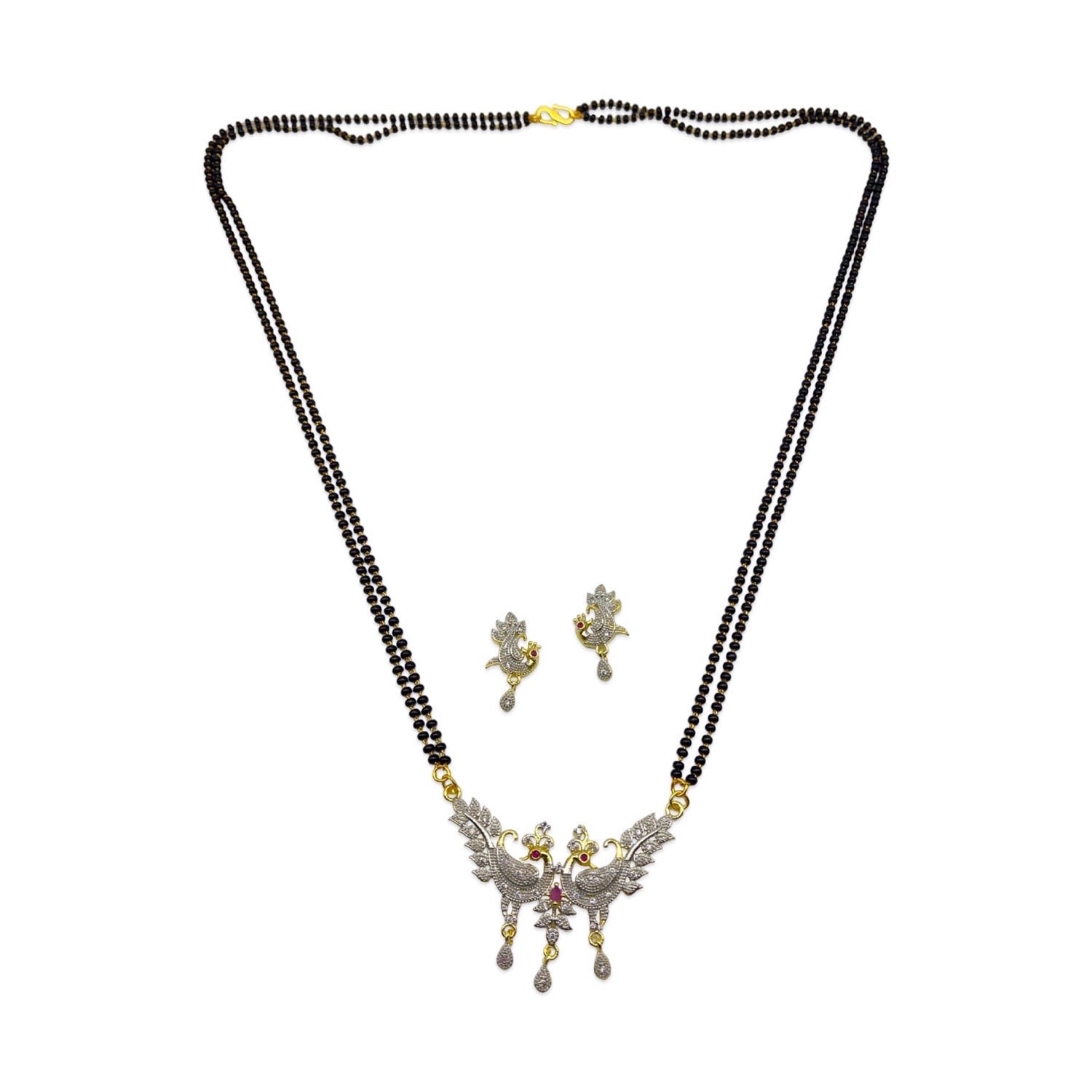 American Diamond Peacock Pendant Long Mangalsutra Set With Earrings 2 Line Black Beads Chain