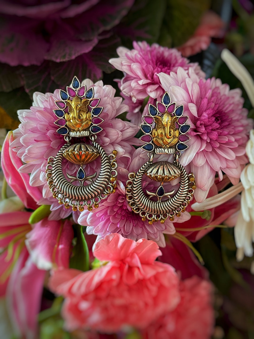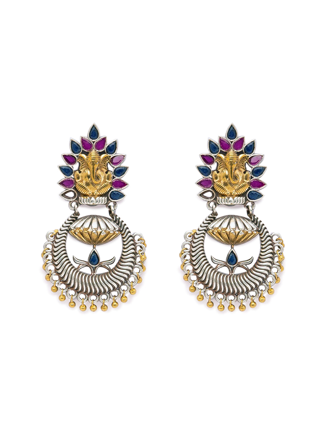 German Oxidized Silver Earrings Antique Ganesha Engraved Multicolor Stones Studded Gungroo Danglers