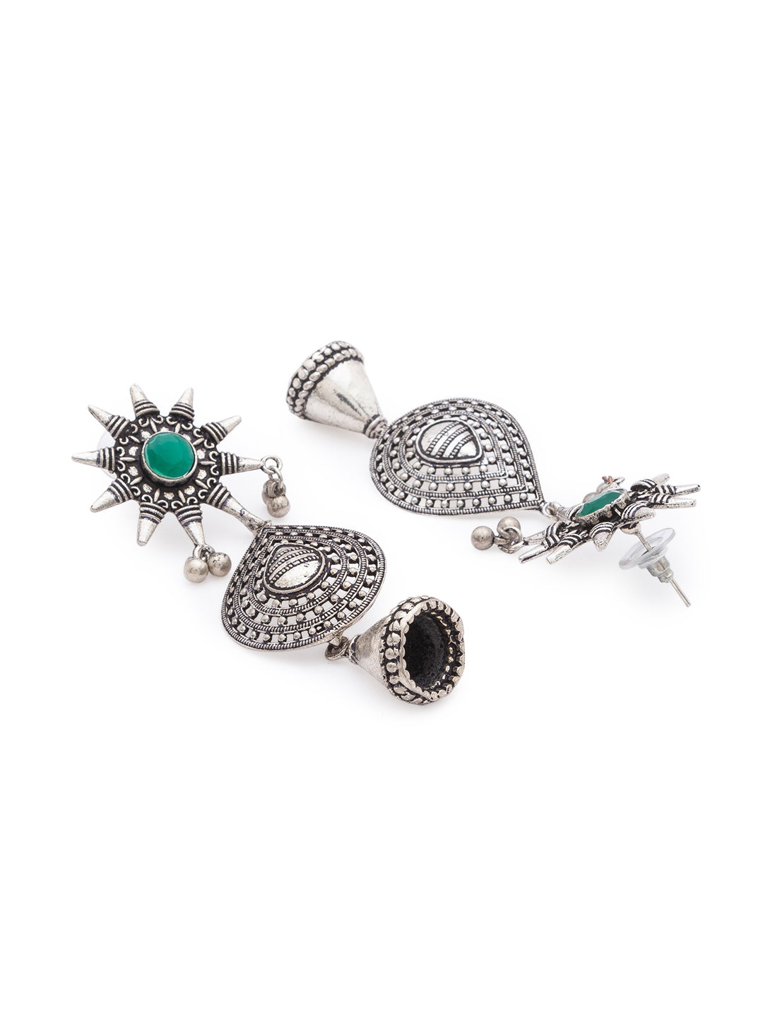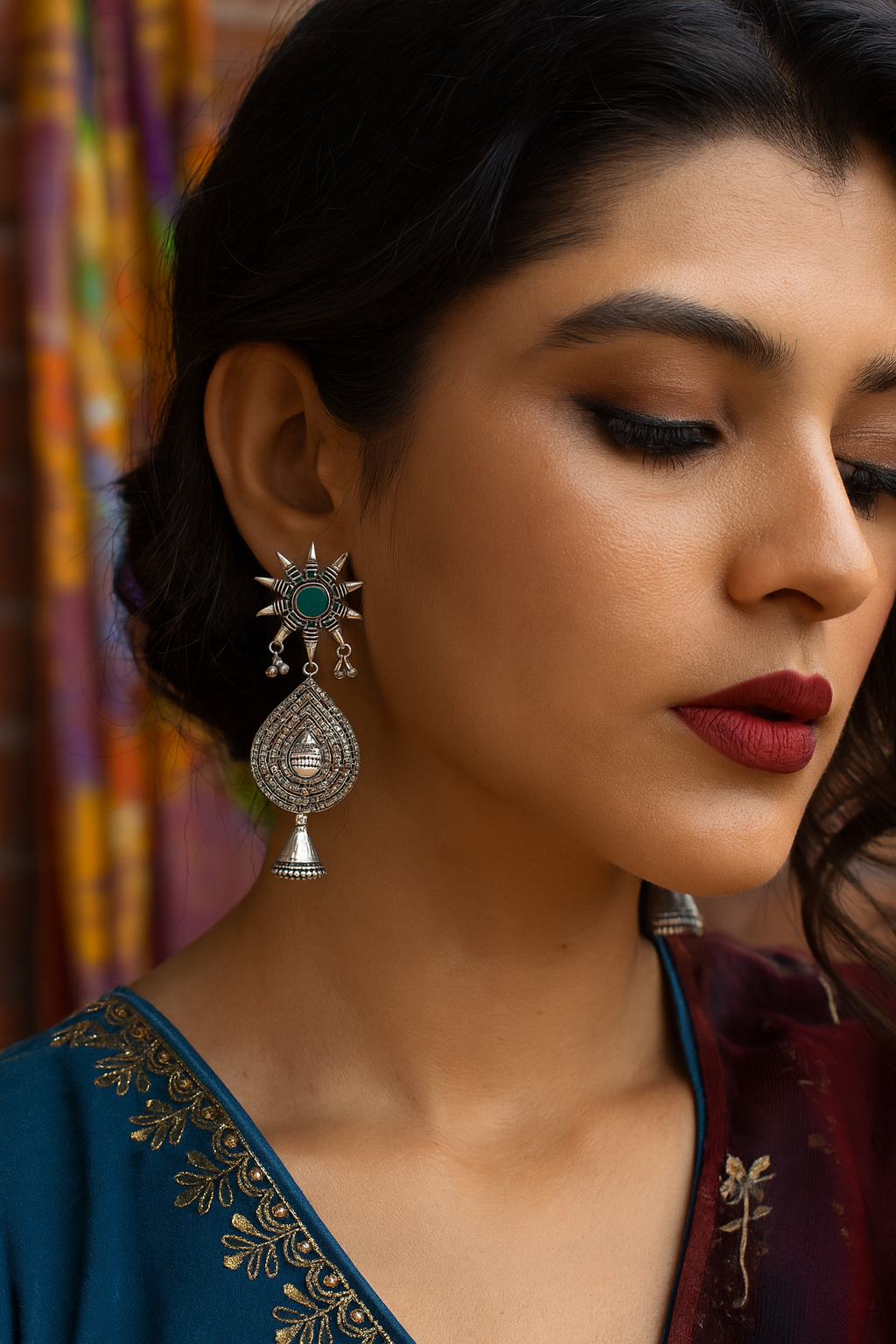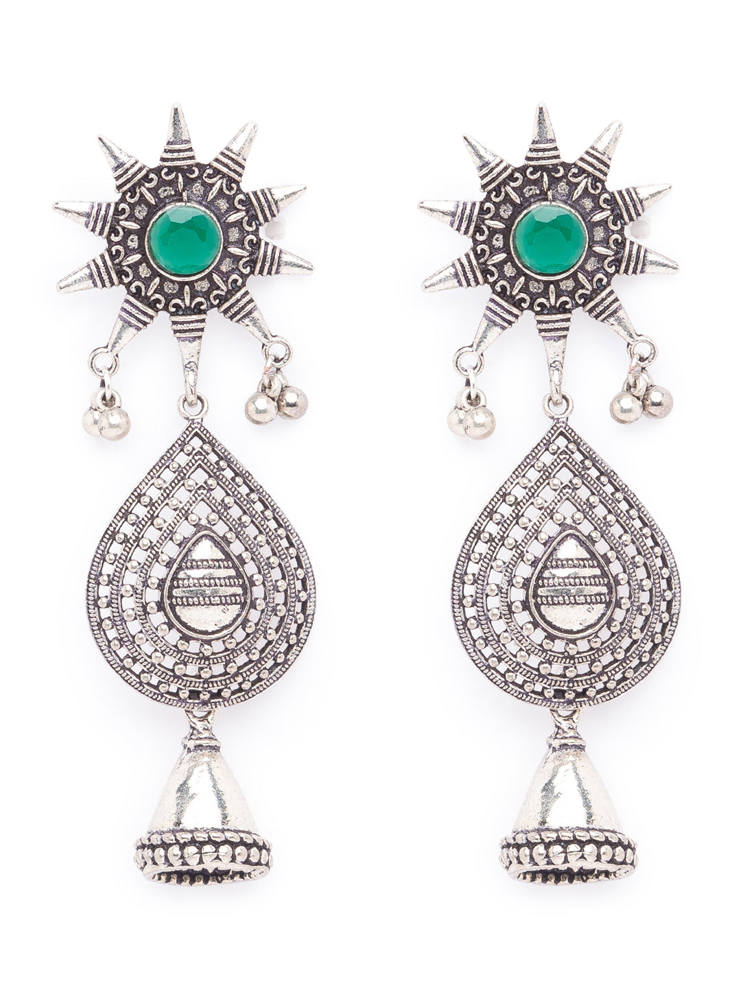 German Oxidized Silver Earrings Antique Look Ethnic Art Stones Studded Danglers