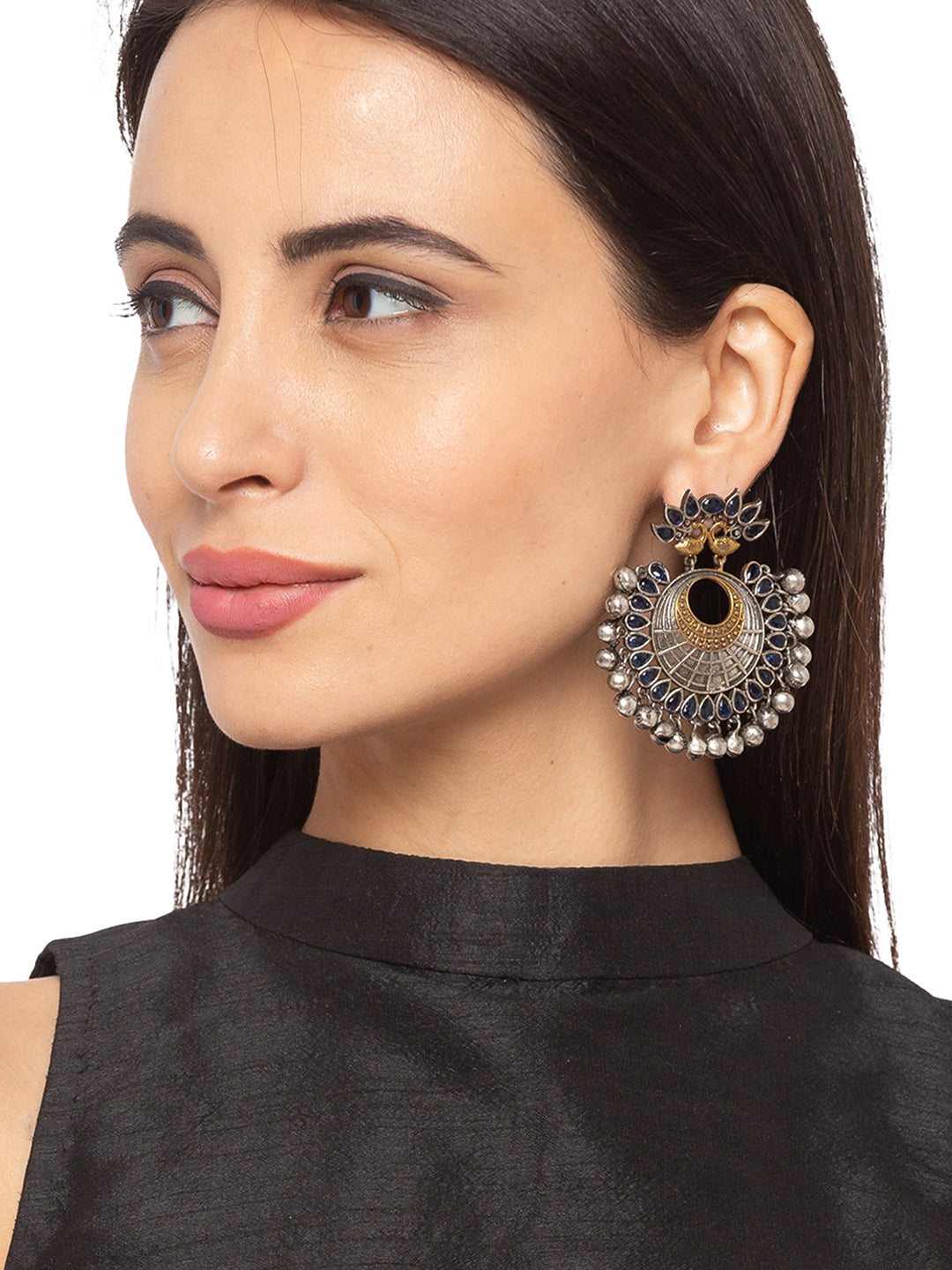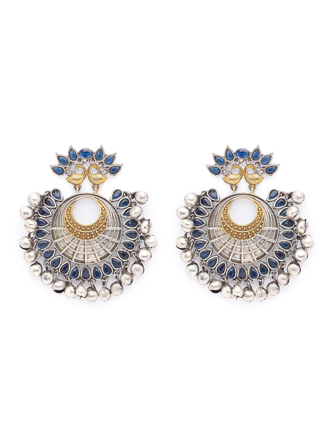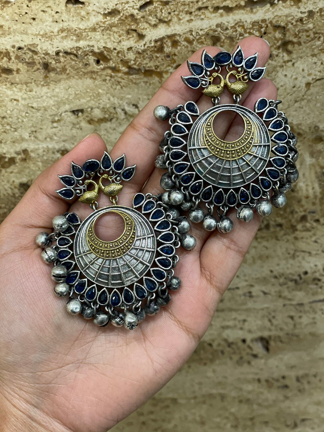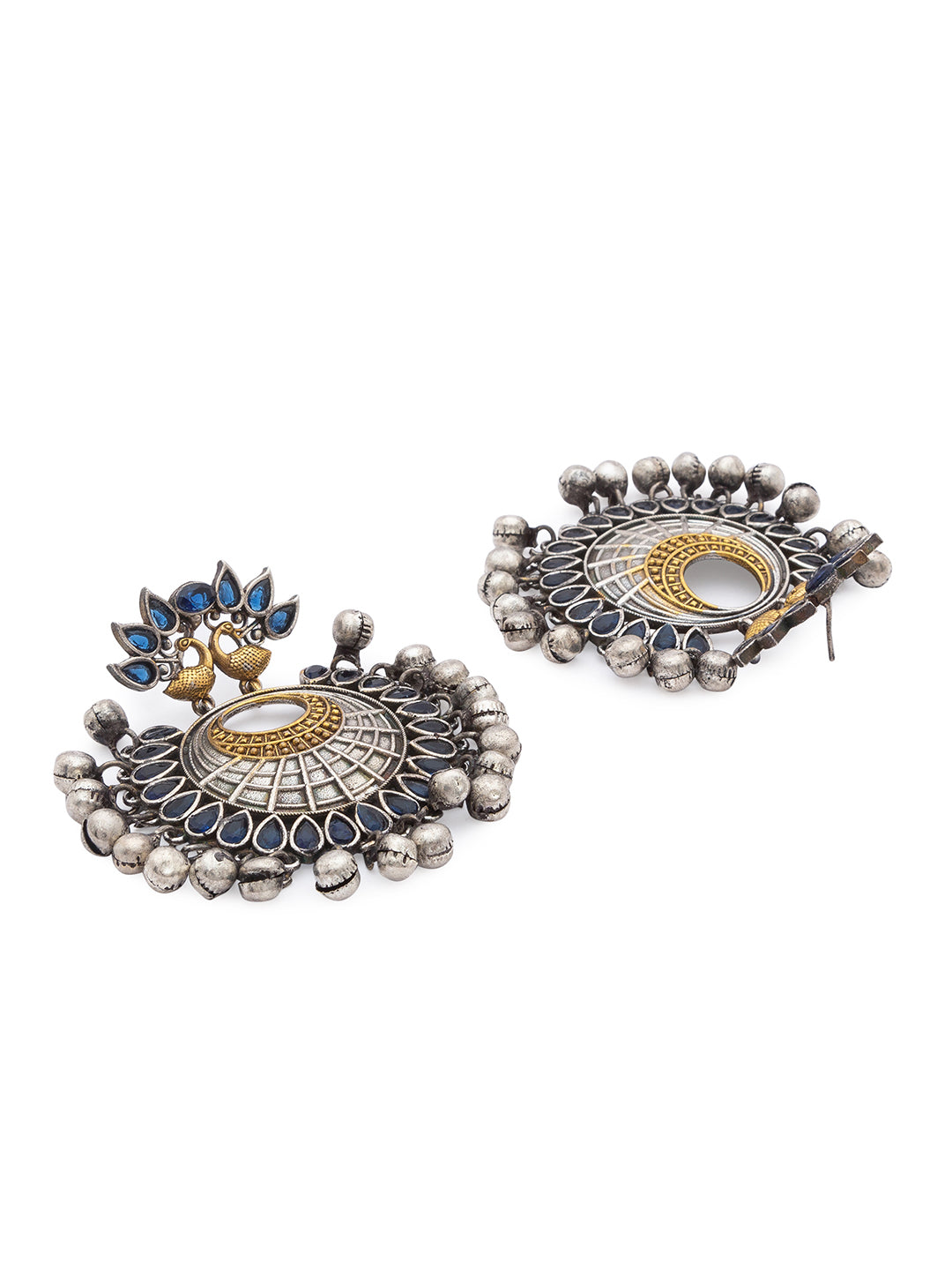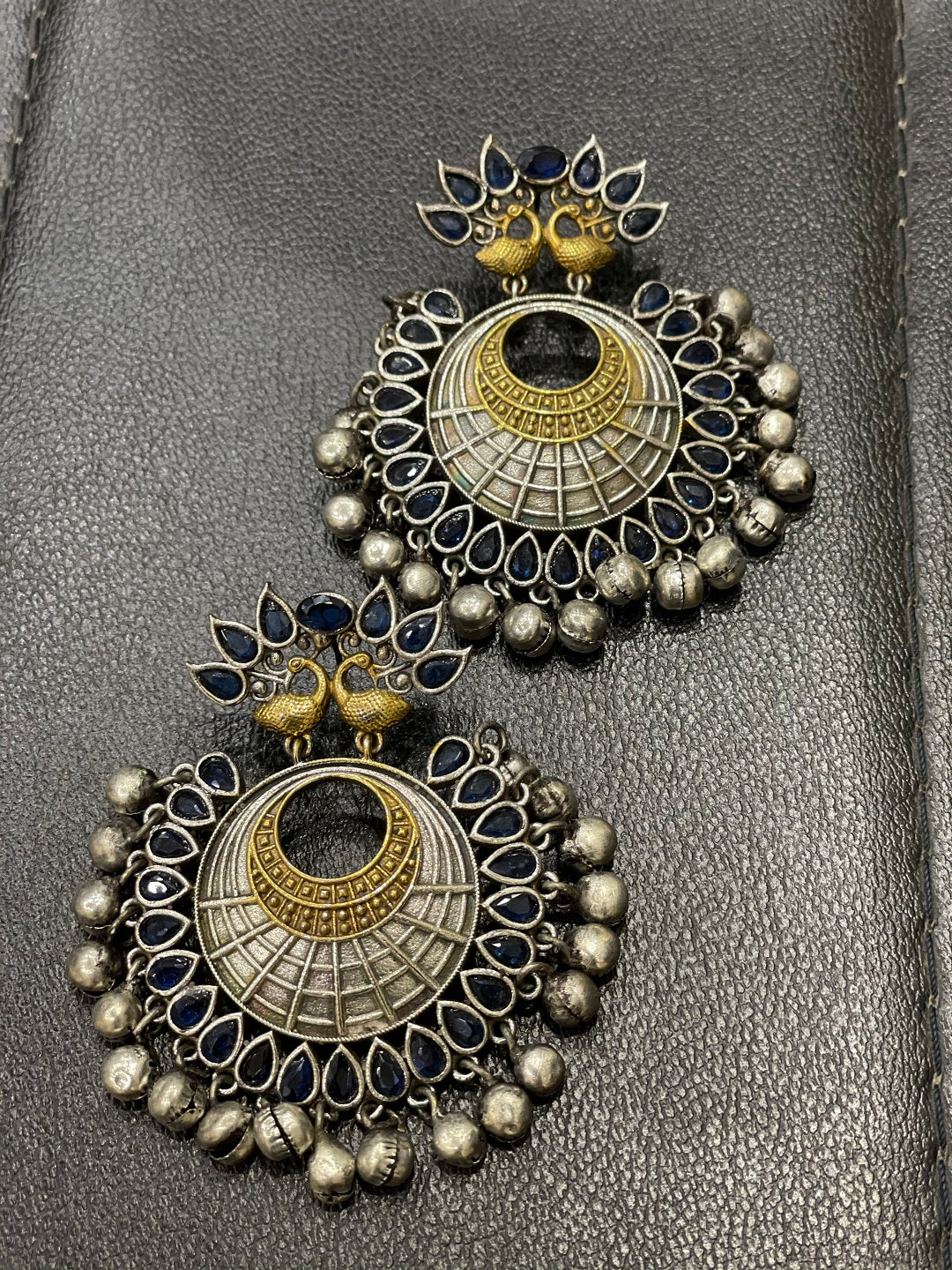 German Oxidized Silver Earrings Antique Tribal Peacock Design Stones Studded Gungroo Danglers