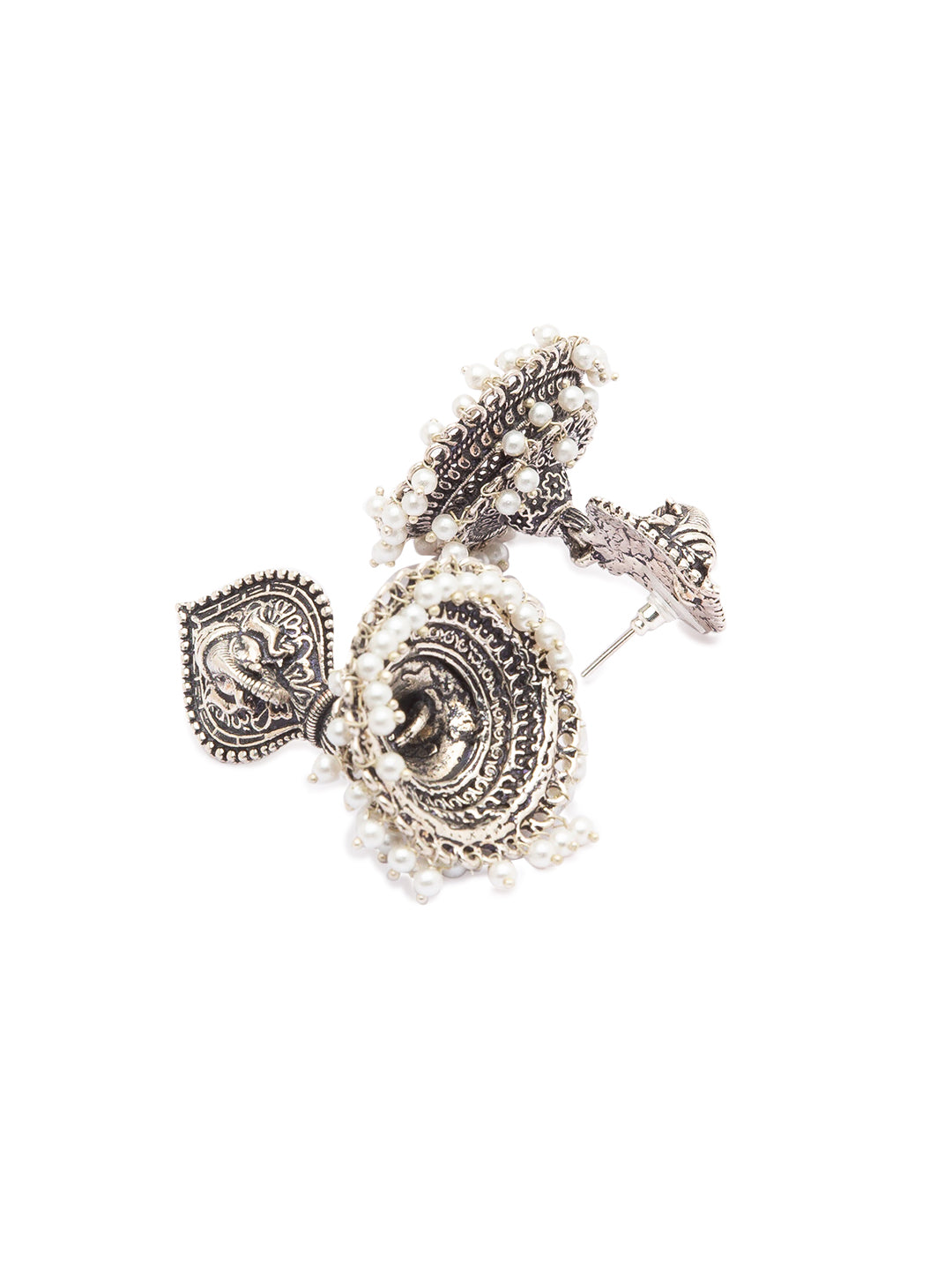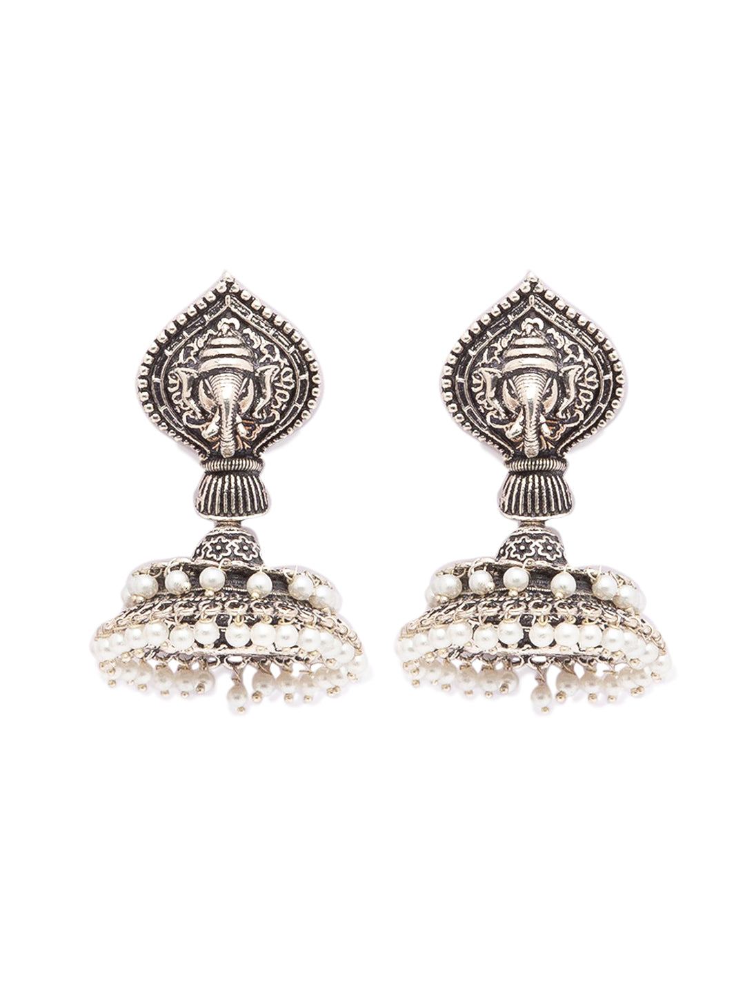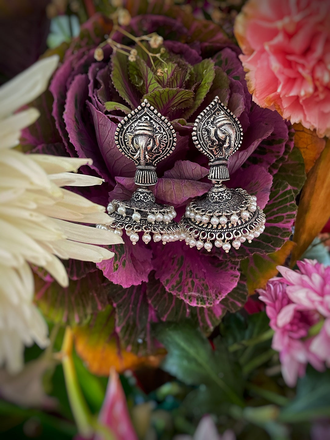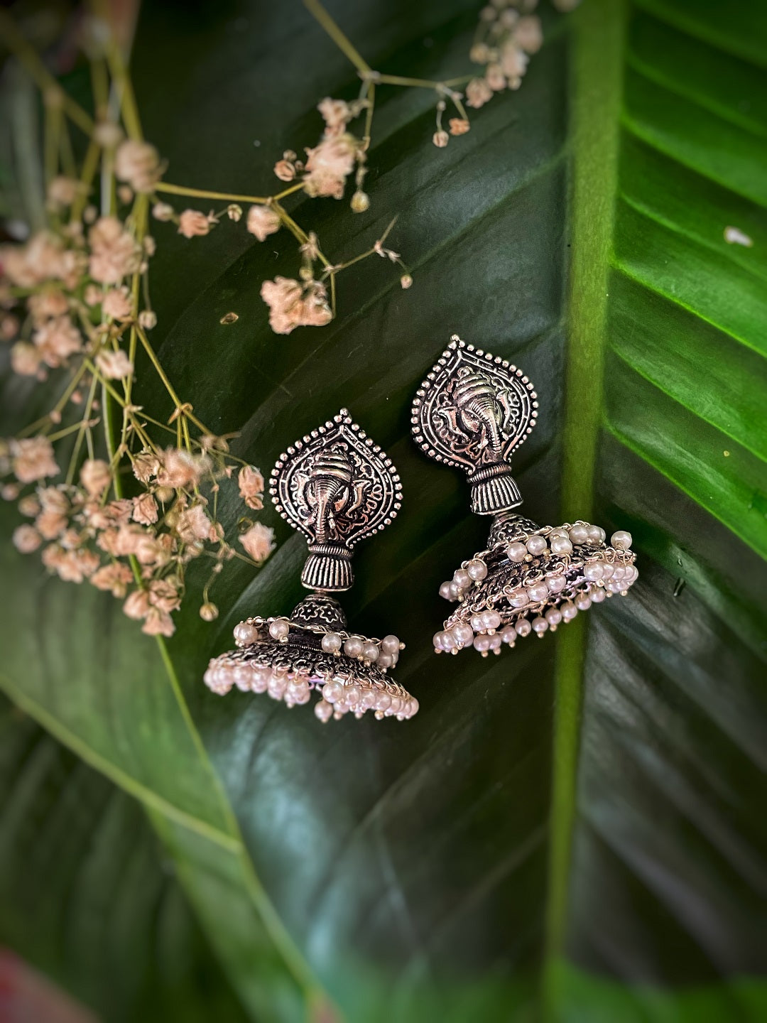German Oxidized Silver Earrings Antique Tribal Trendy Ganesha Engraved Lightweight Dangler Jhumka