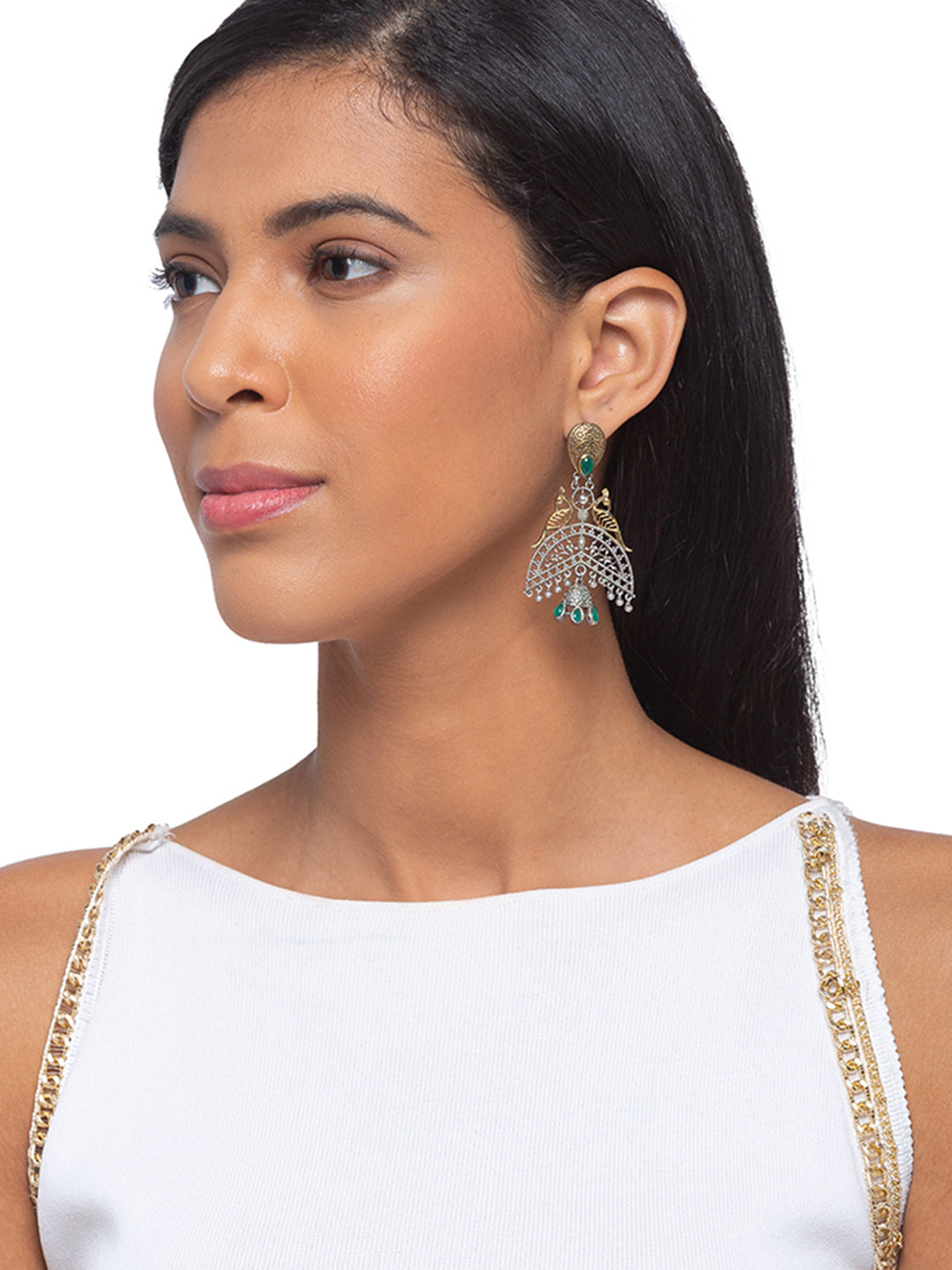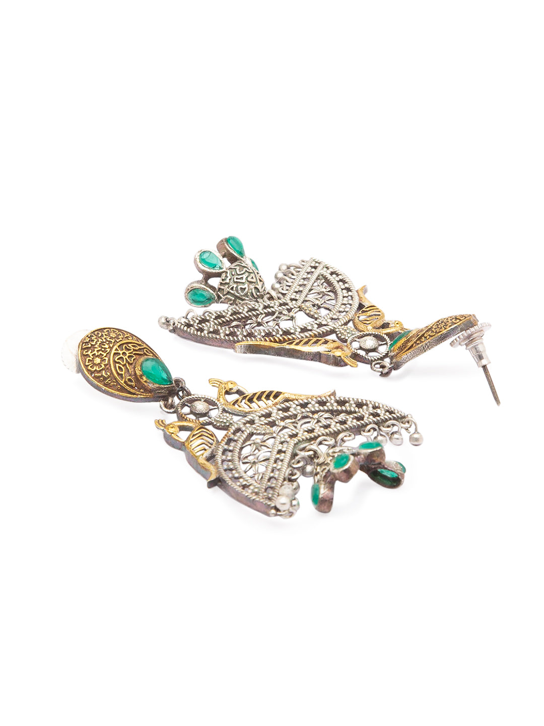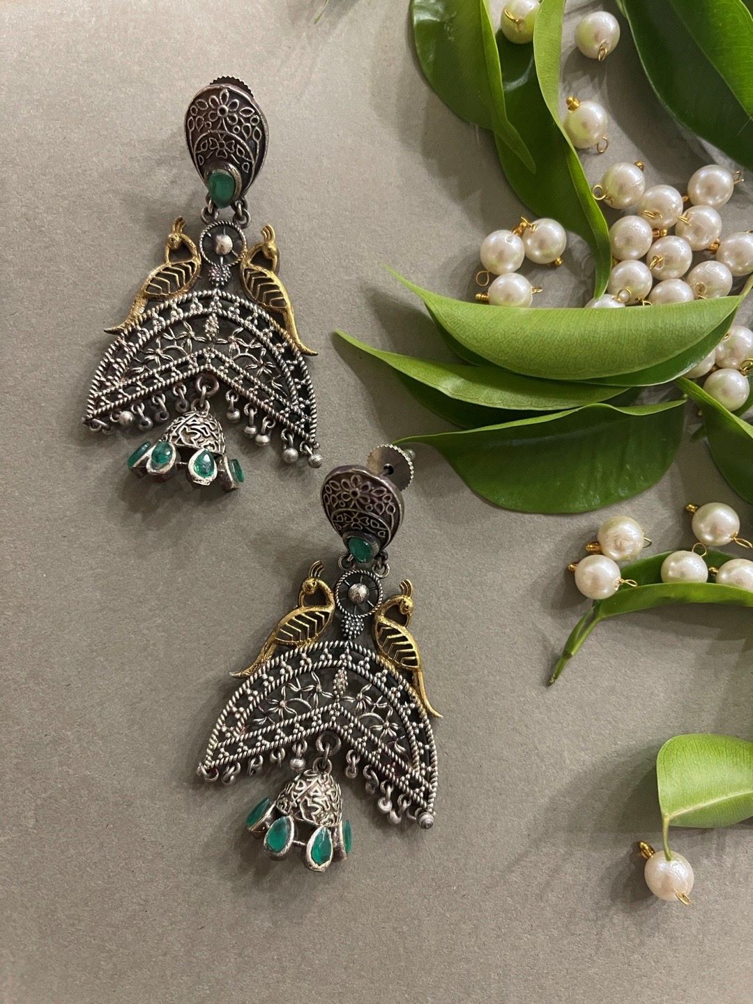 German Oxidized Silver Earrings Antique Tribal Trendy Peacock Design Engraved Danglers