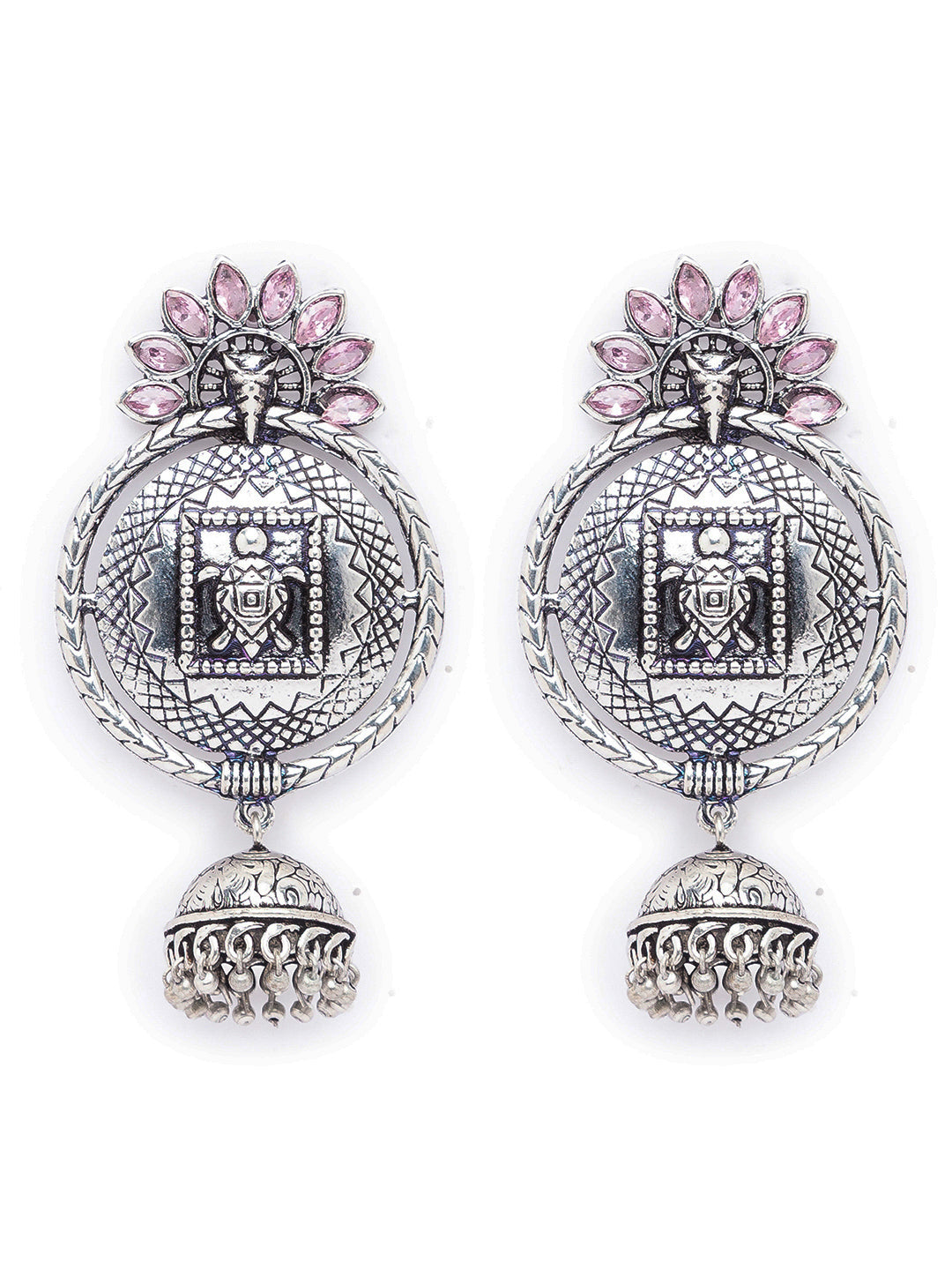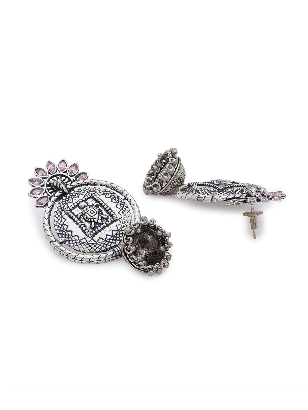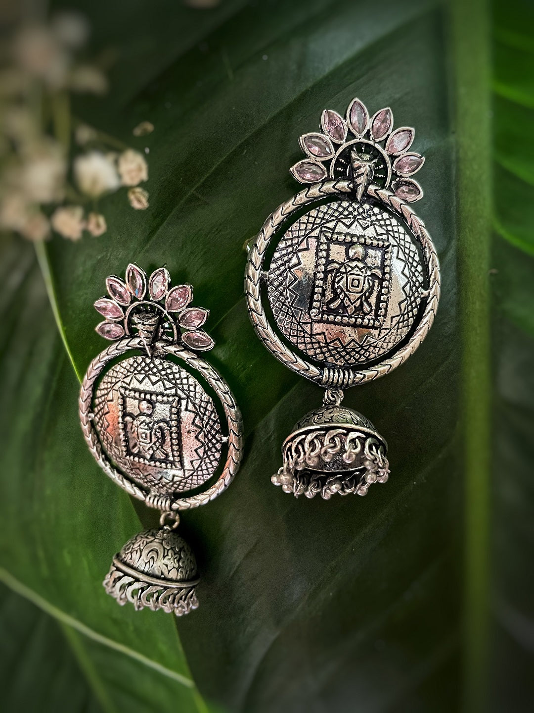 German Oxidized Silver Earrings Tortoise Engraved Design Pink Stones Studded Dangler Jhumka
