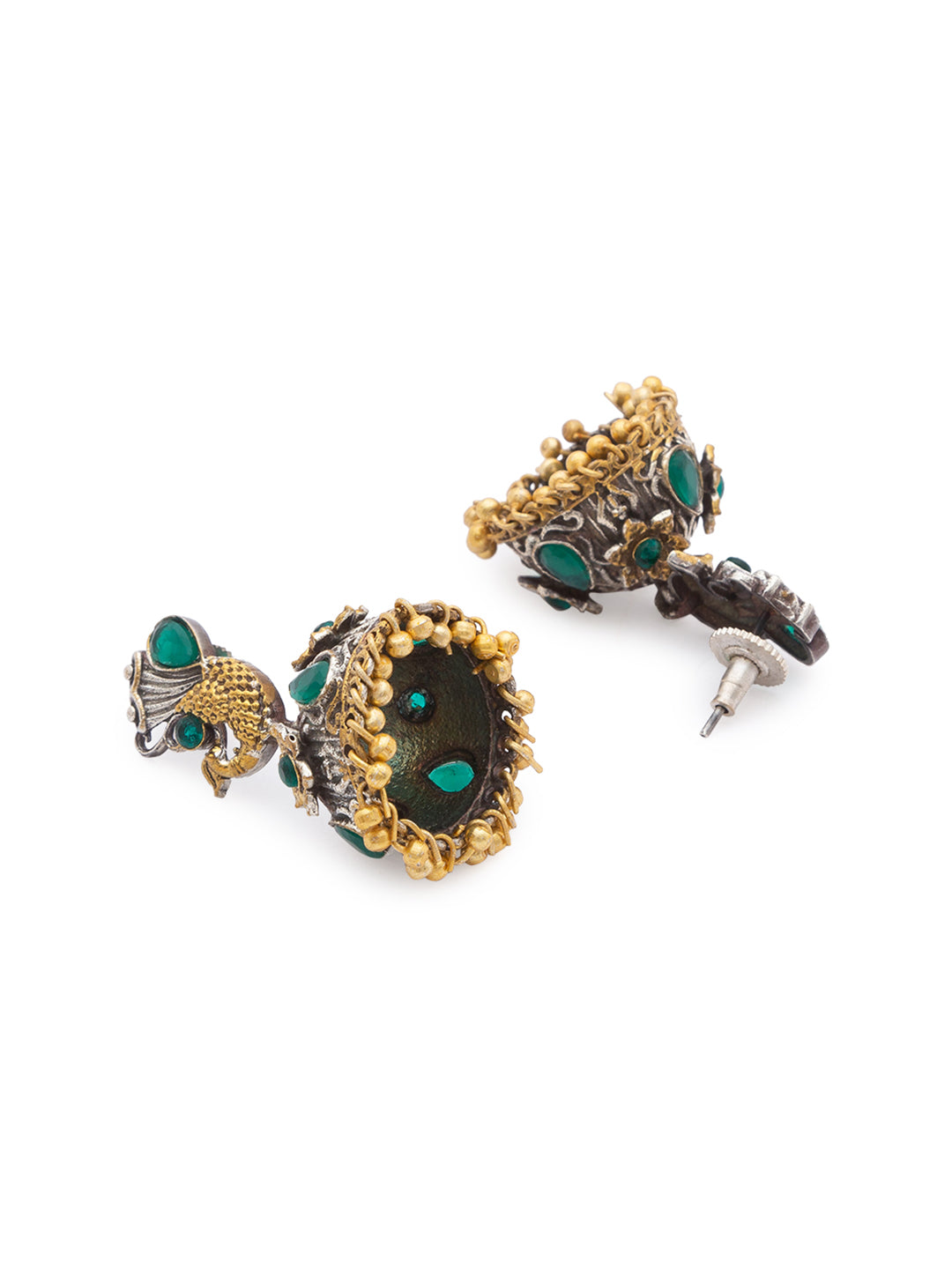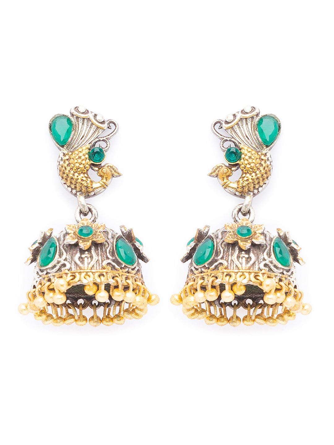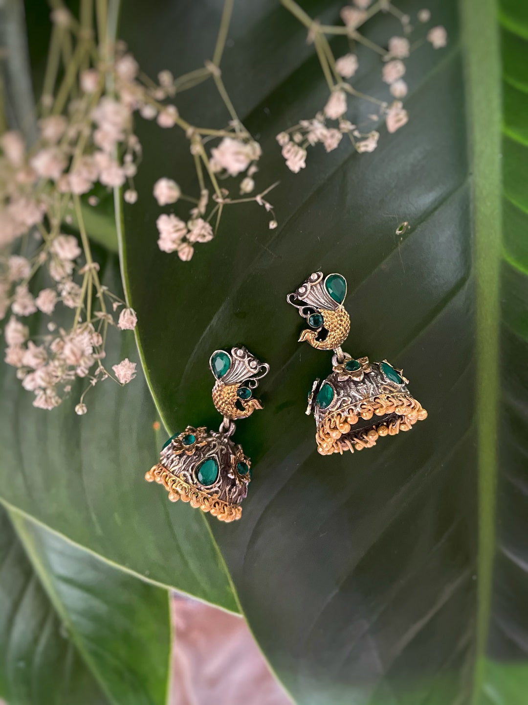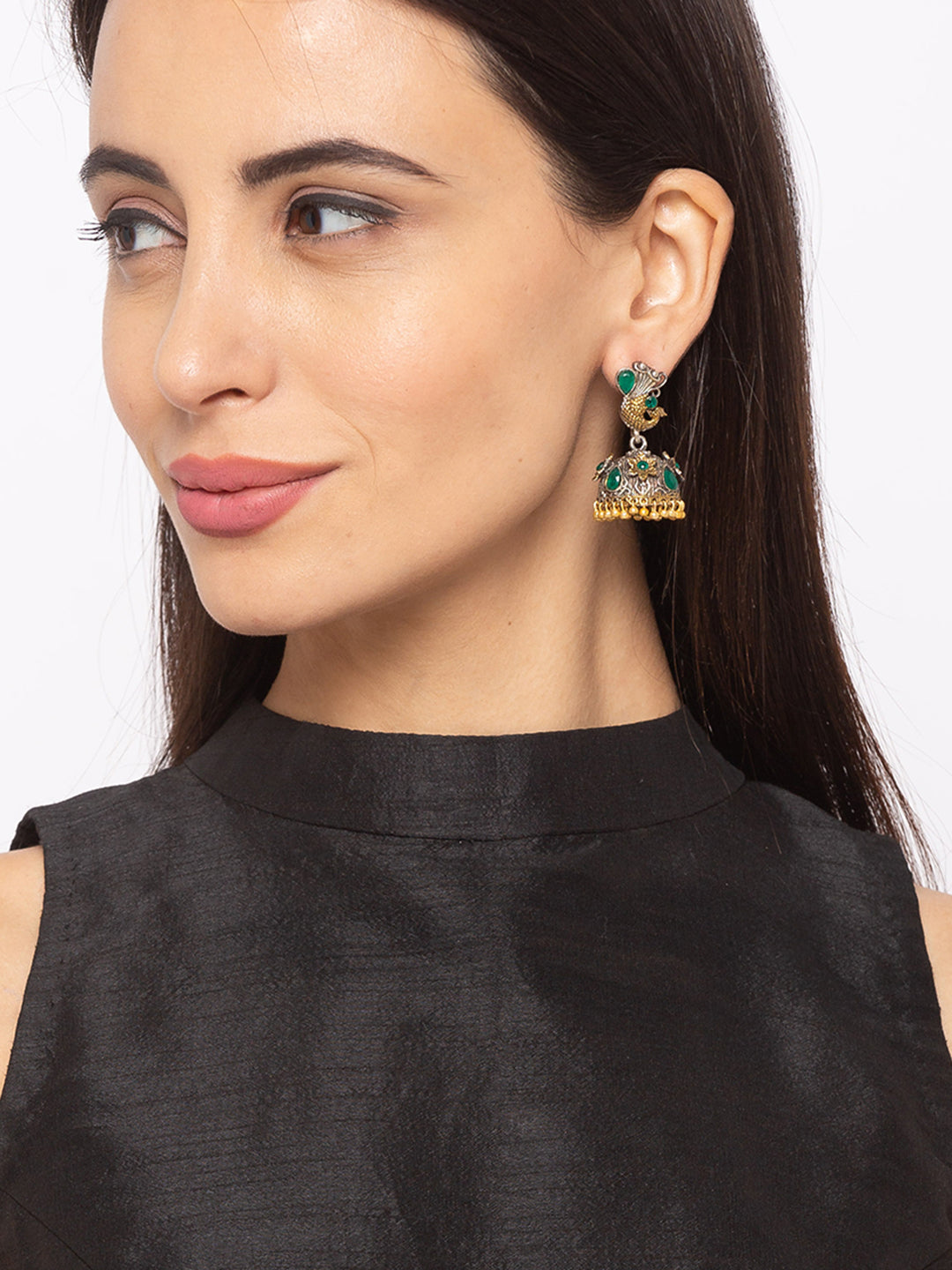 German Oxidized Silver Earrings Tribal Peacock Engraved Lightweight Stones Studded Danglers