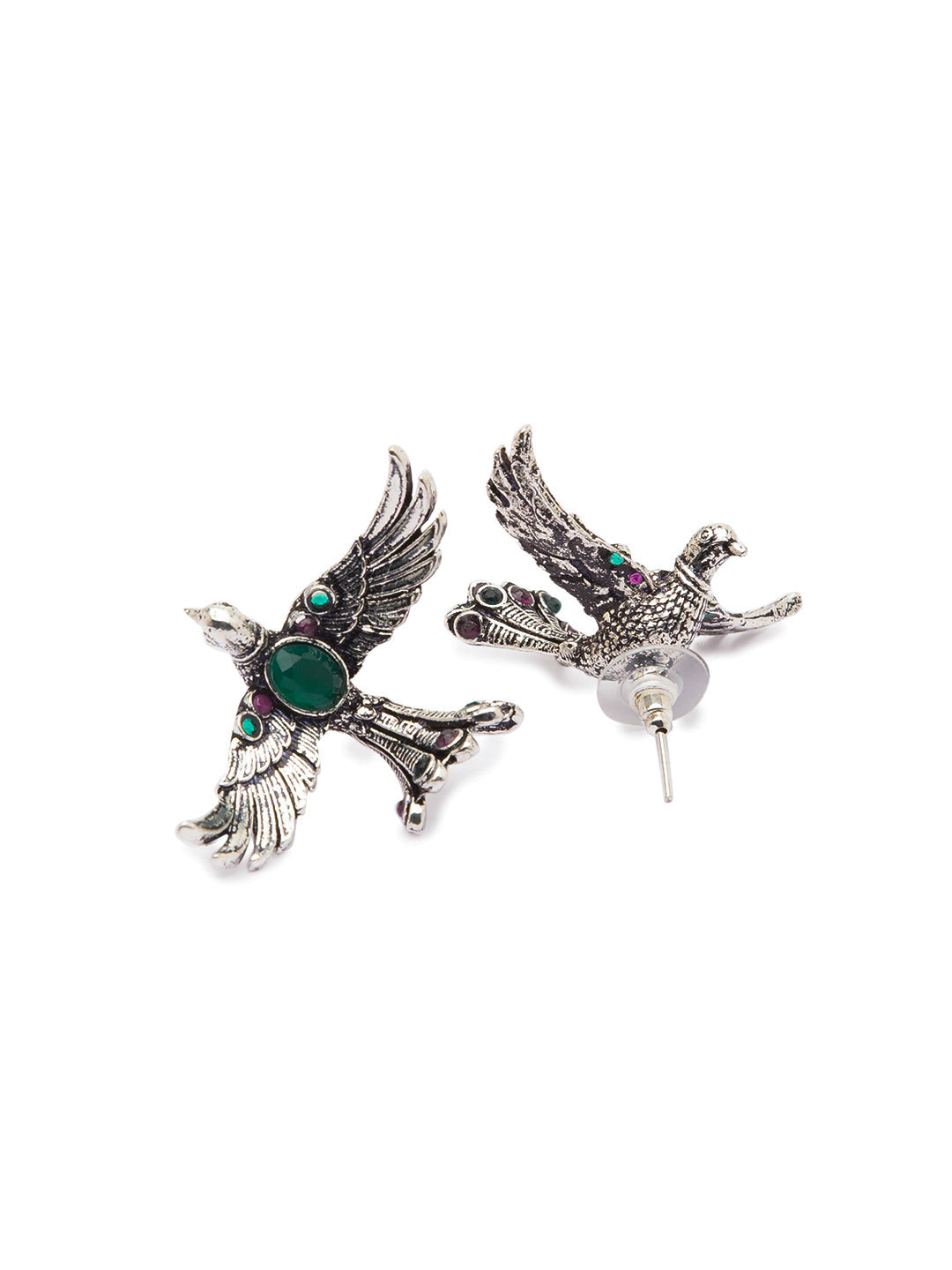 German Silver Oxidized Earrings Birds Design Engraved Red/Green stone studded Danglers