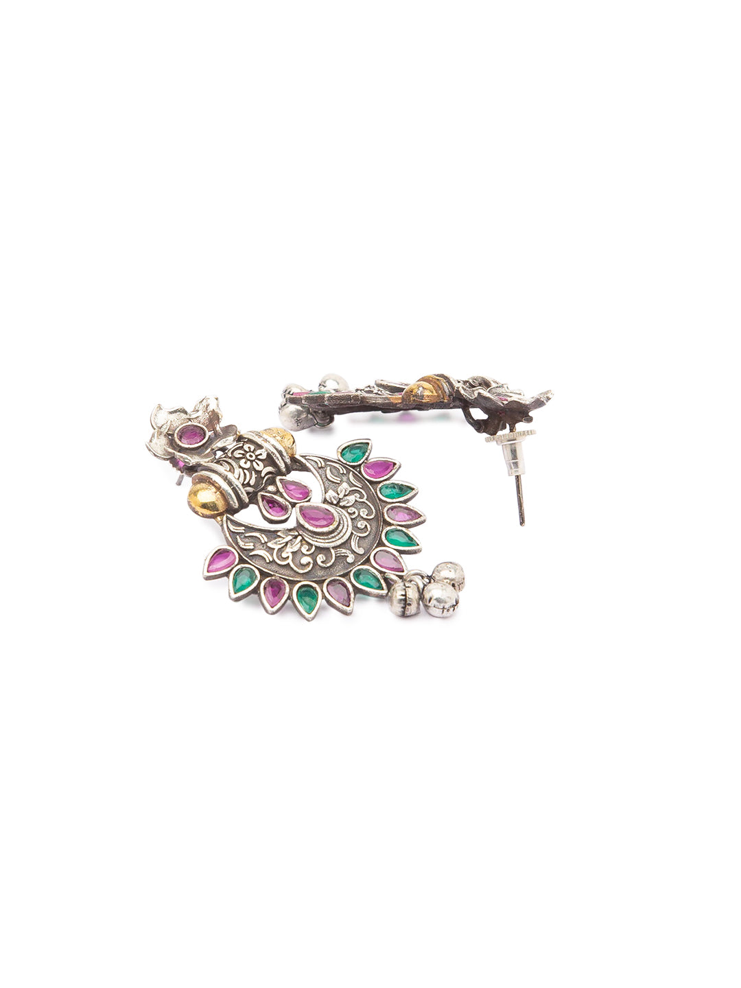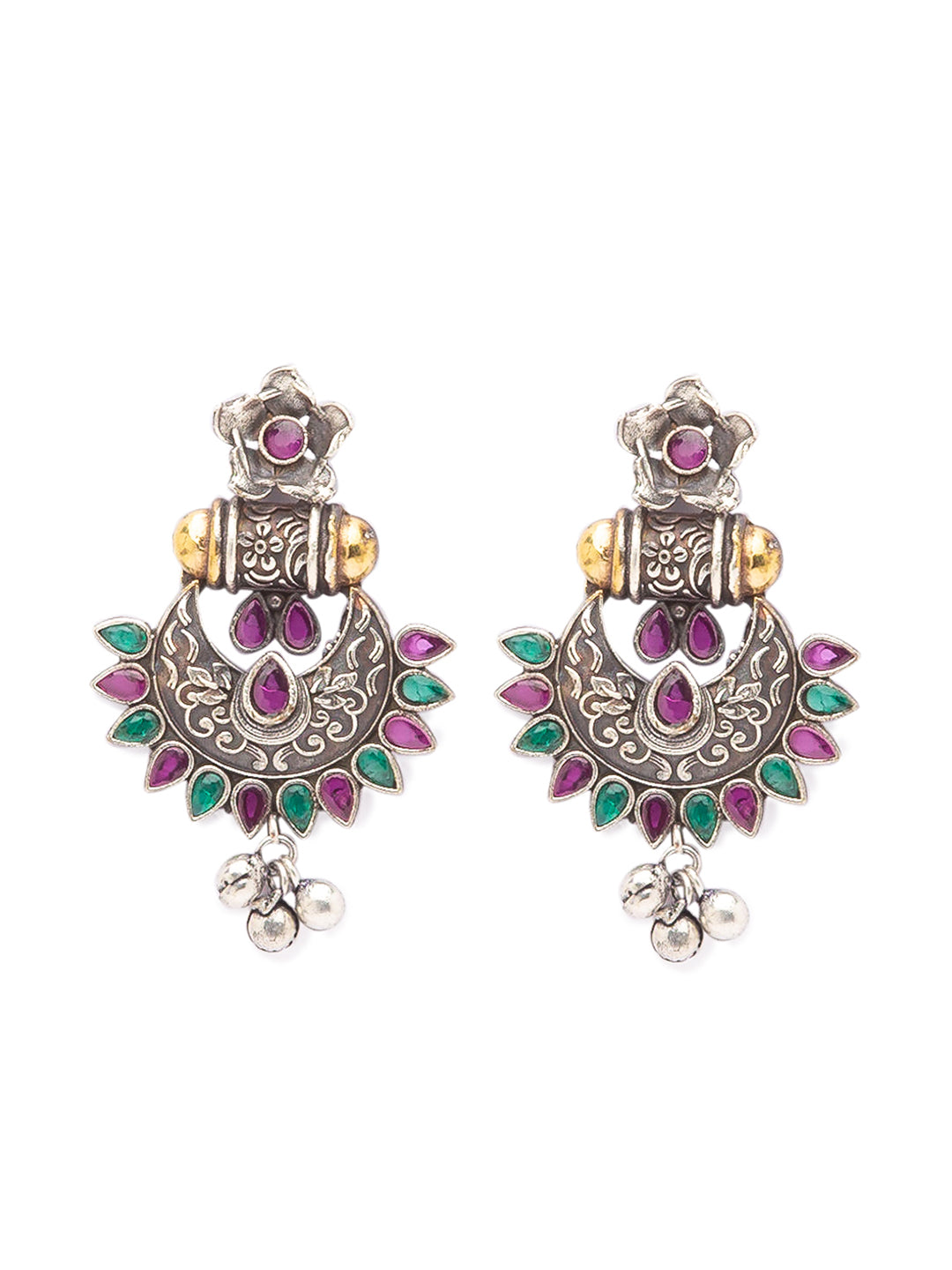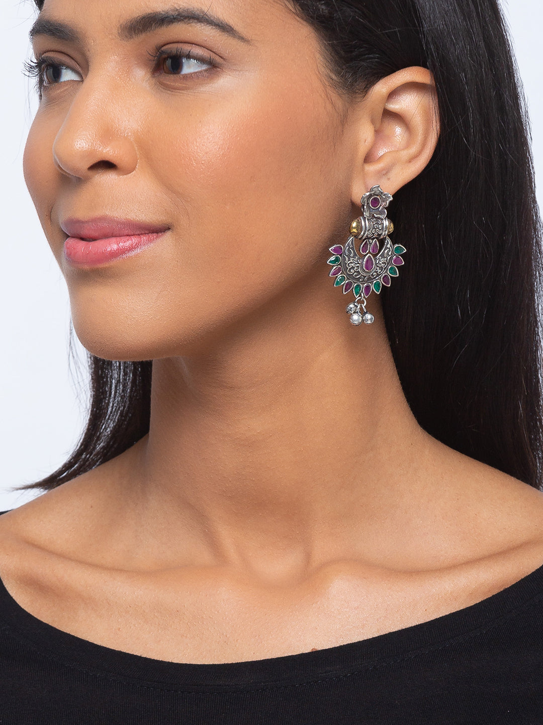 German Silver Oxidized Earrings Flower/Chandbali Design Multicolor Stones Studded Gungroo Danglers