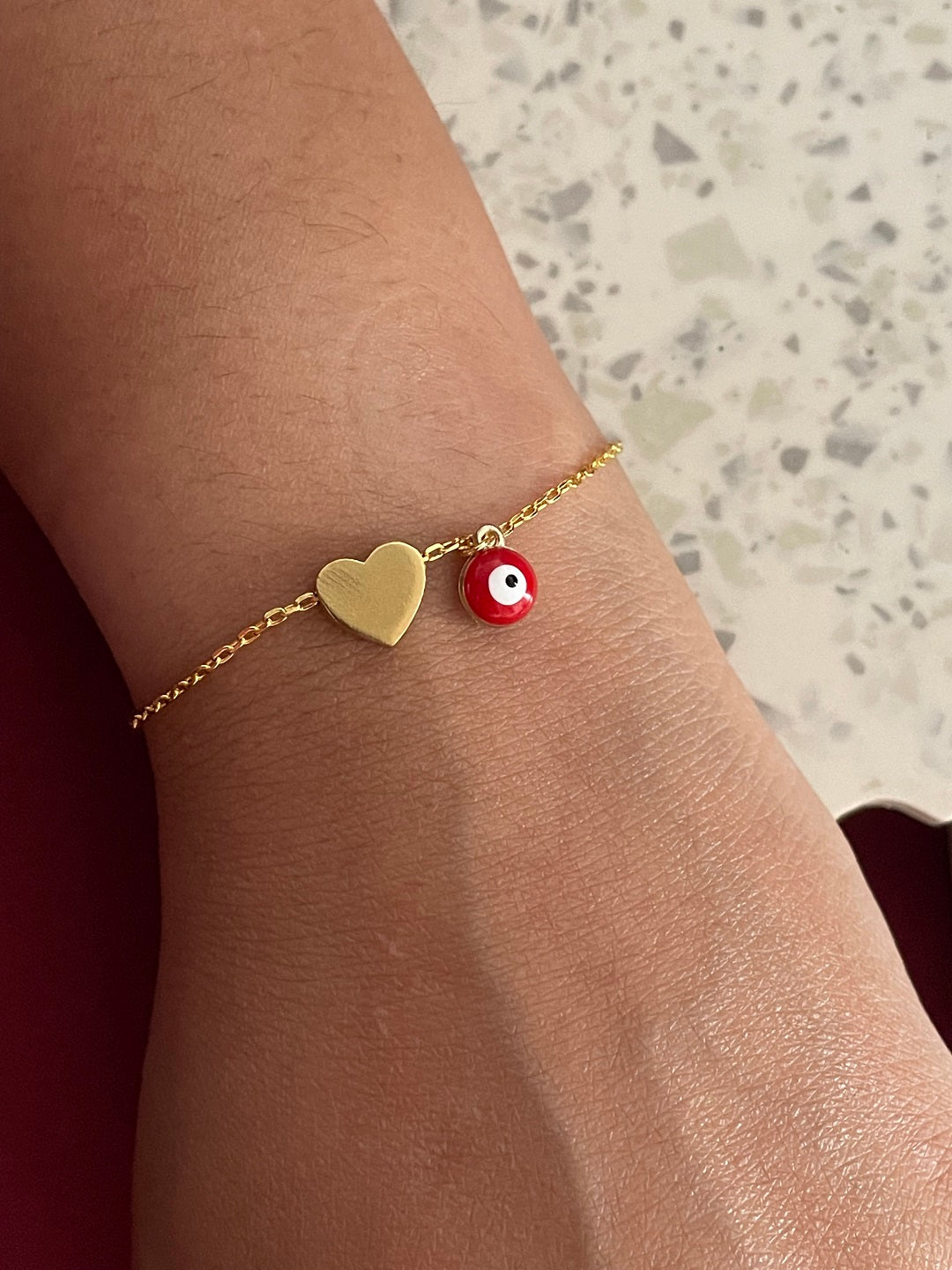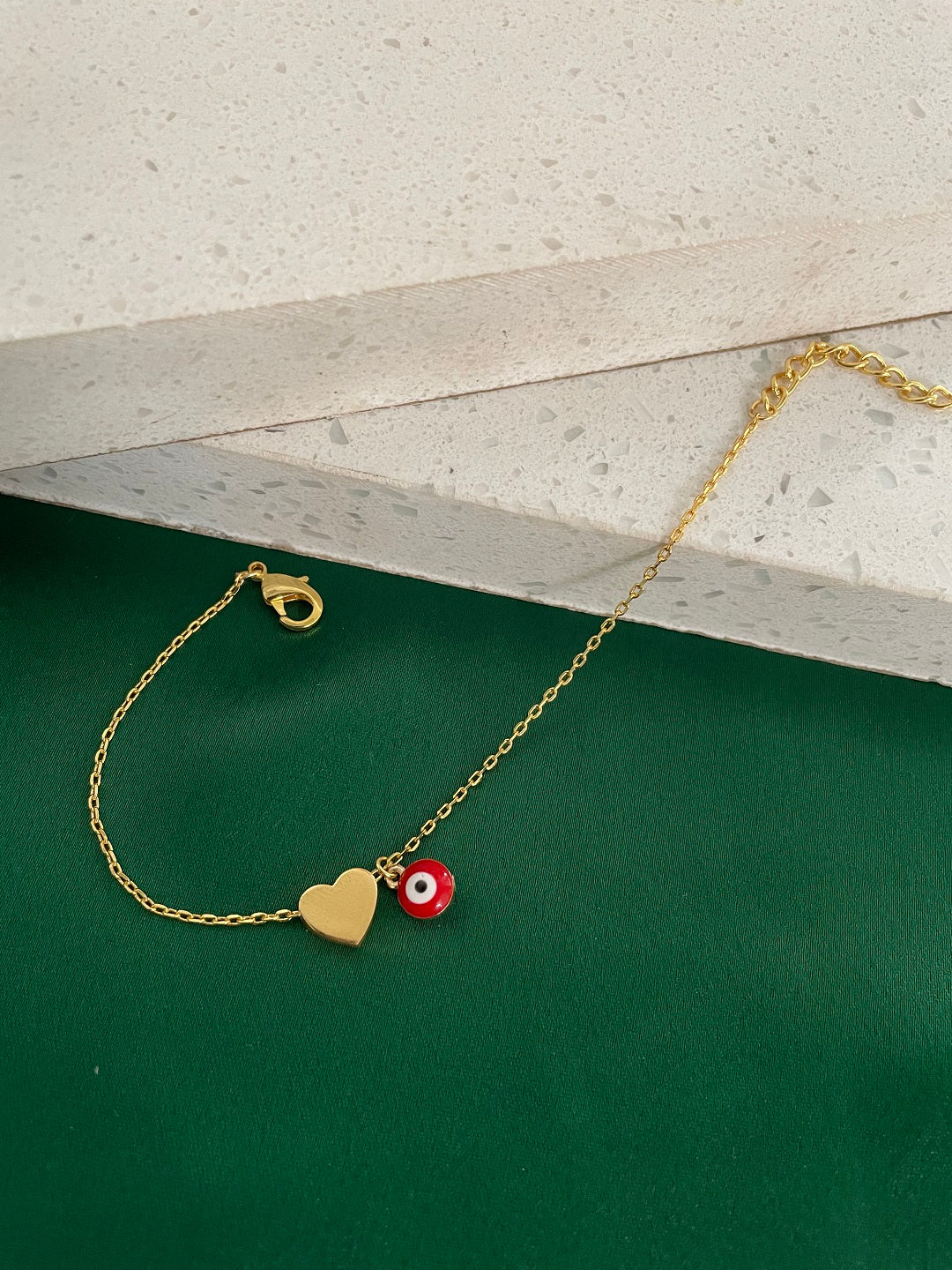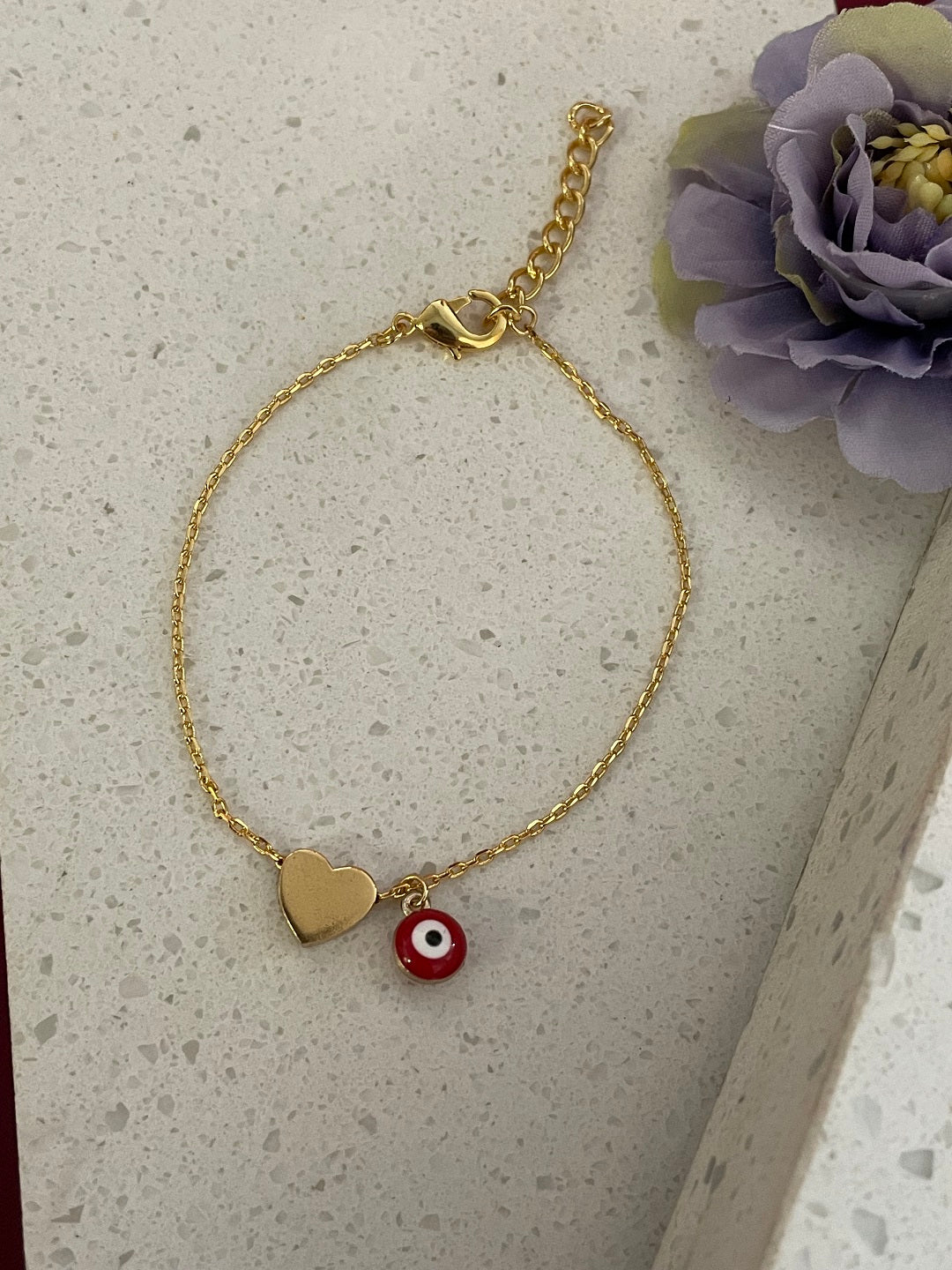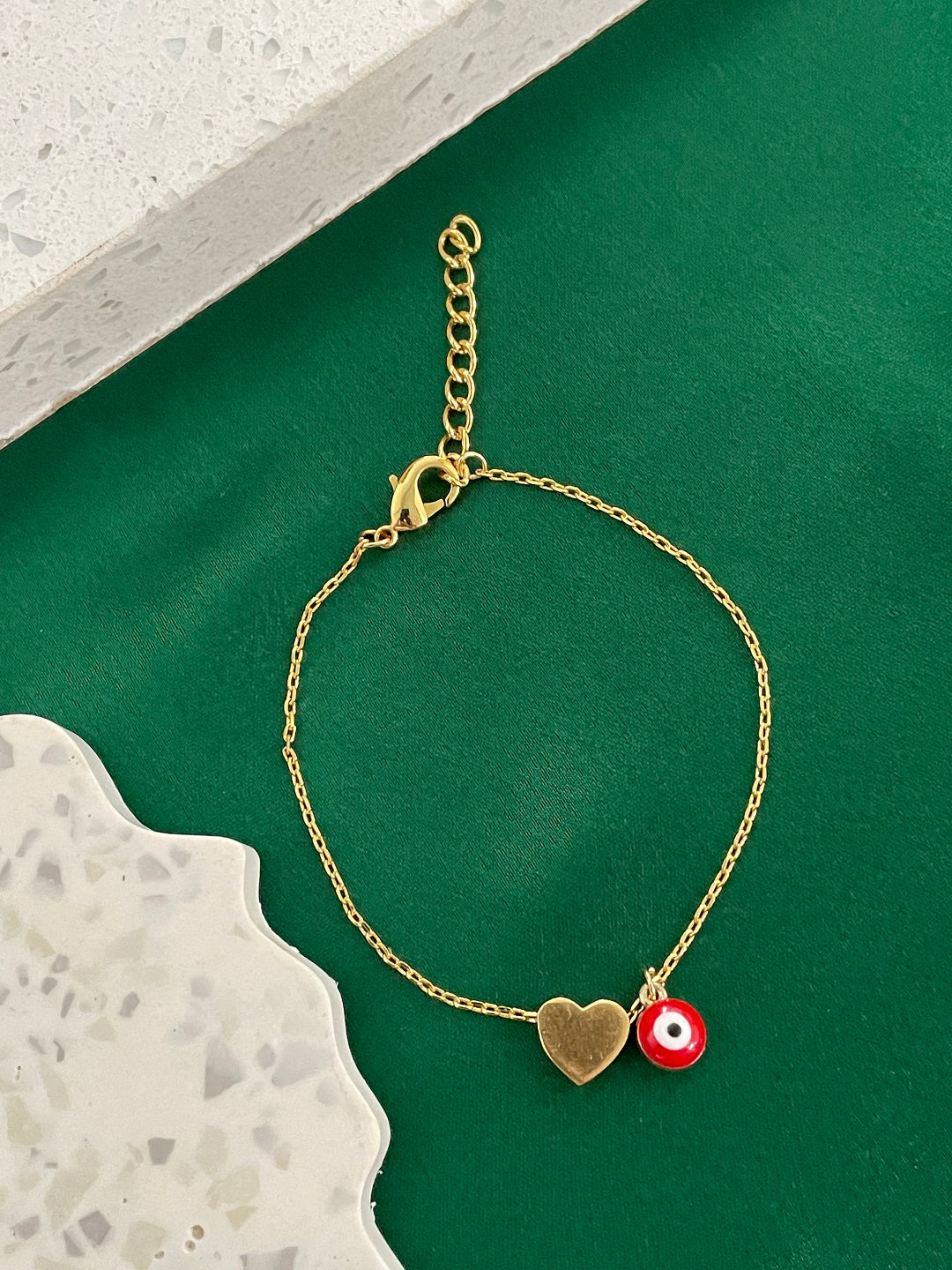 Gold Plated Heart Bracelet with Red Evil Eye Charm