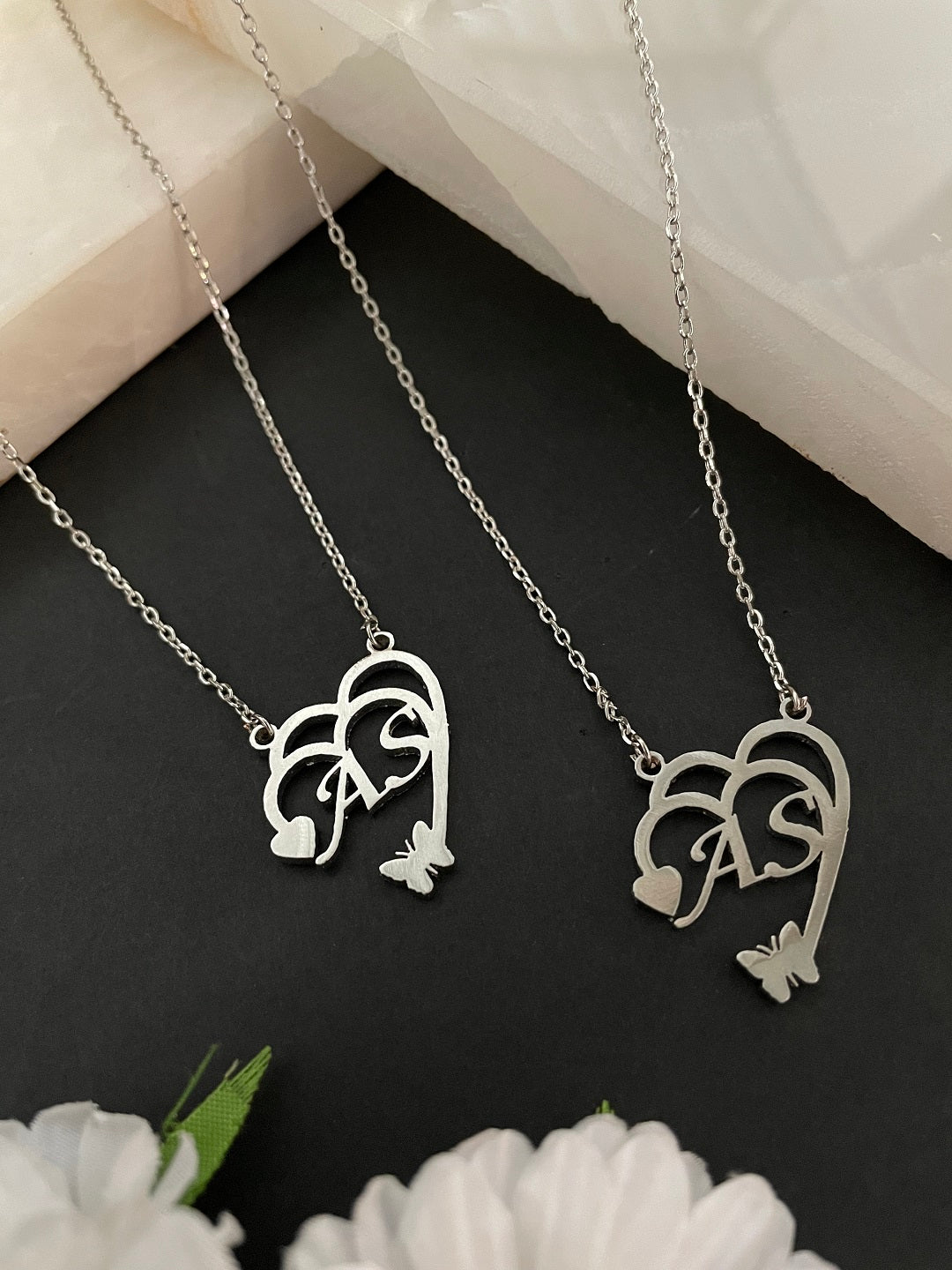 Heart Shape Pendant With 2 Letters And Butterfly Silver Plated Chain Necklace