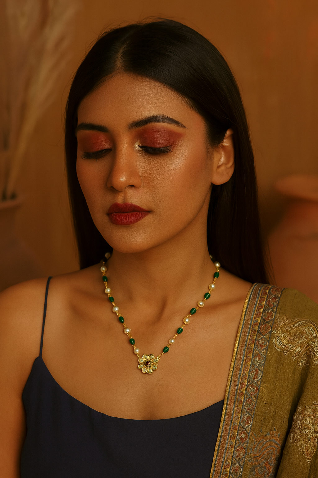 Kundan Flower Pearl & Green Beads Short Necklace design