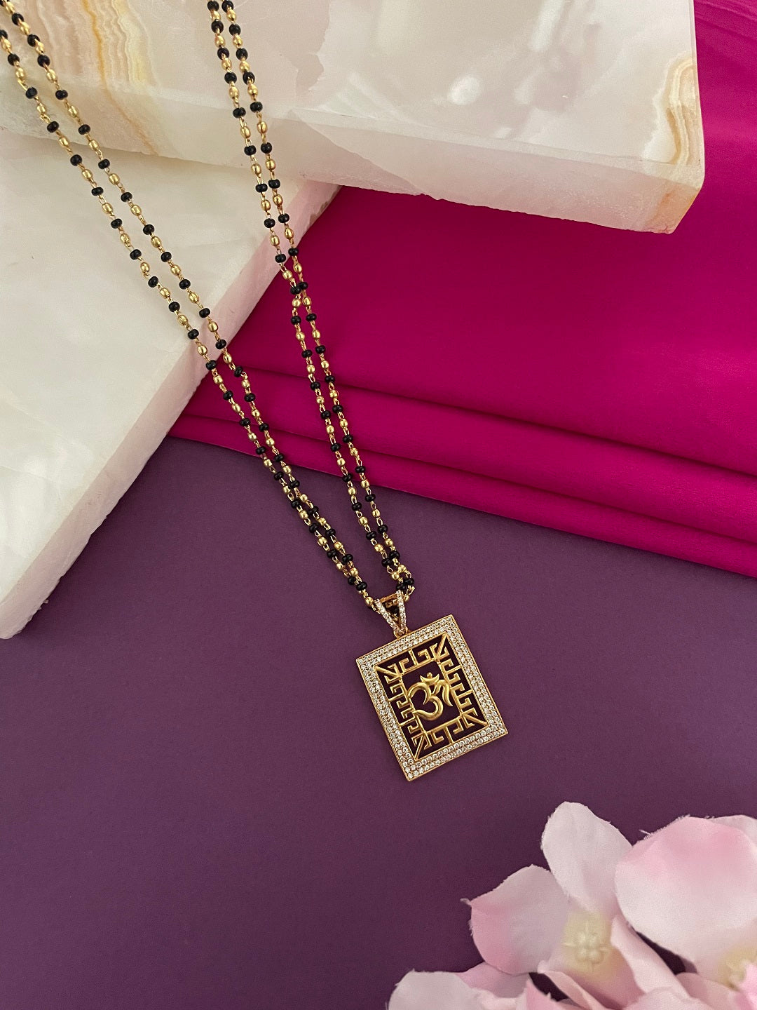 Modern Long Mangalsutra Designs American Diamond Om Pendant Simple Gold And Black Beads Chain