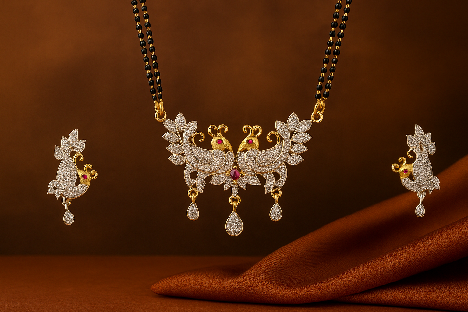Short Mangalsutra Designs Gold Plated Latest American Diamond Peacock Pendant 19 Inches Mangalsutra & Earrings