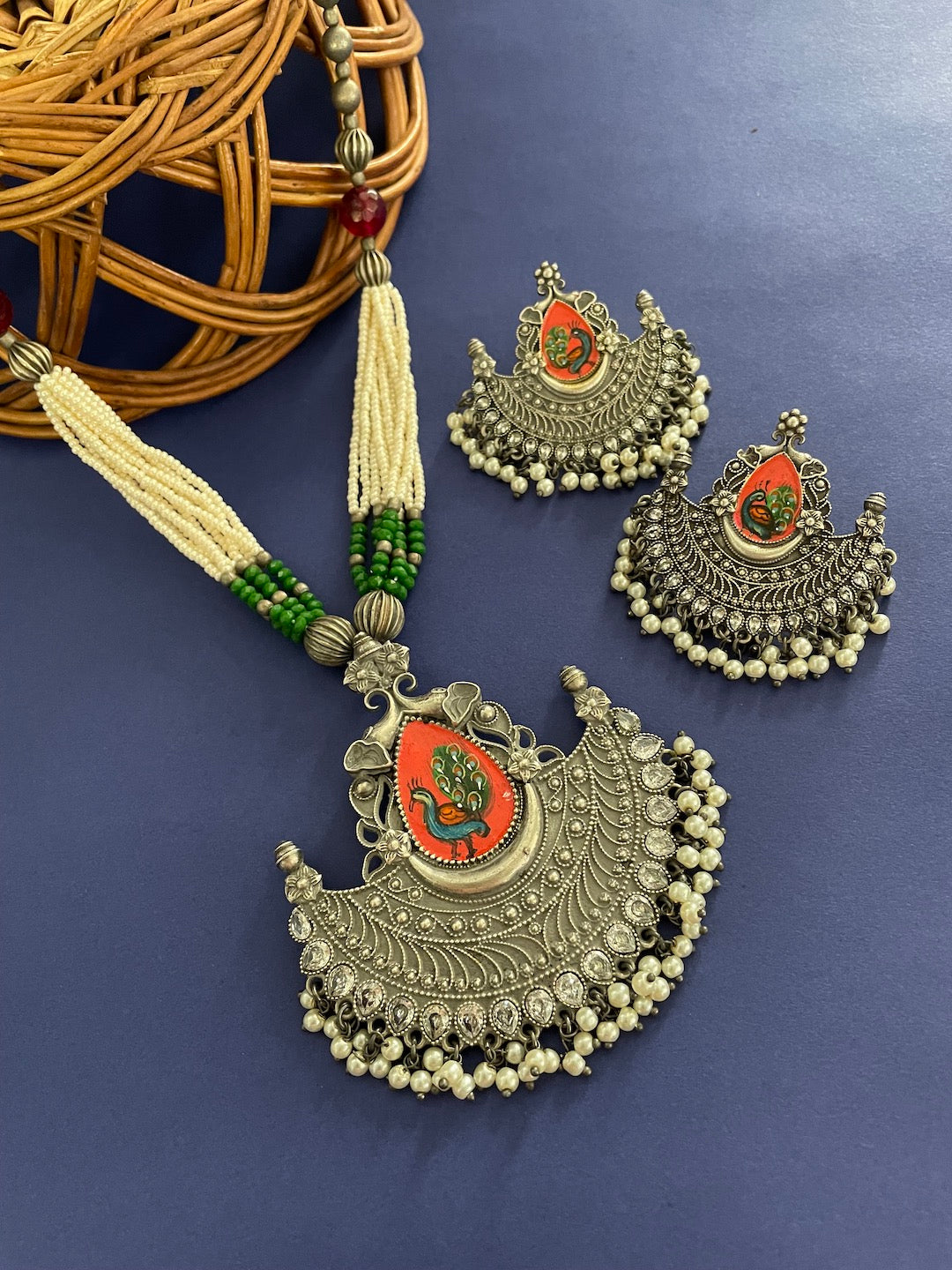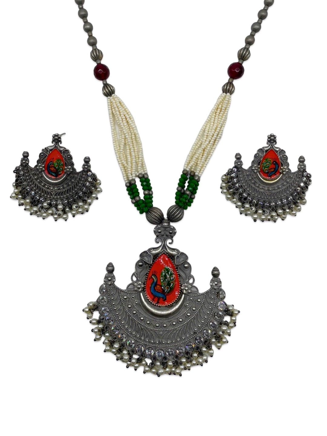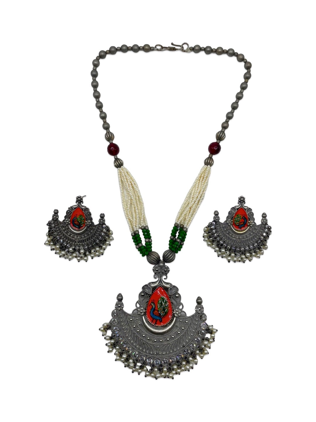 Silver Necklace Set Peacock Beads Design