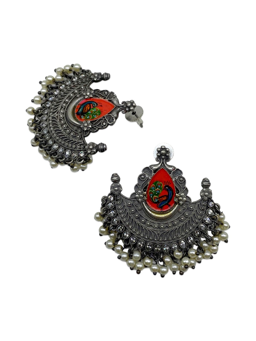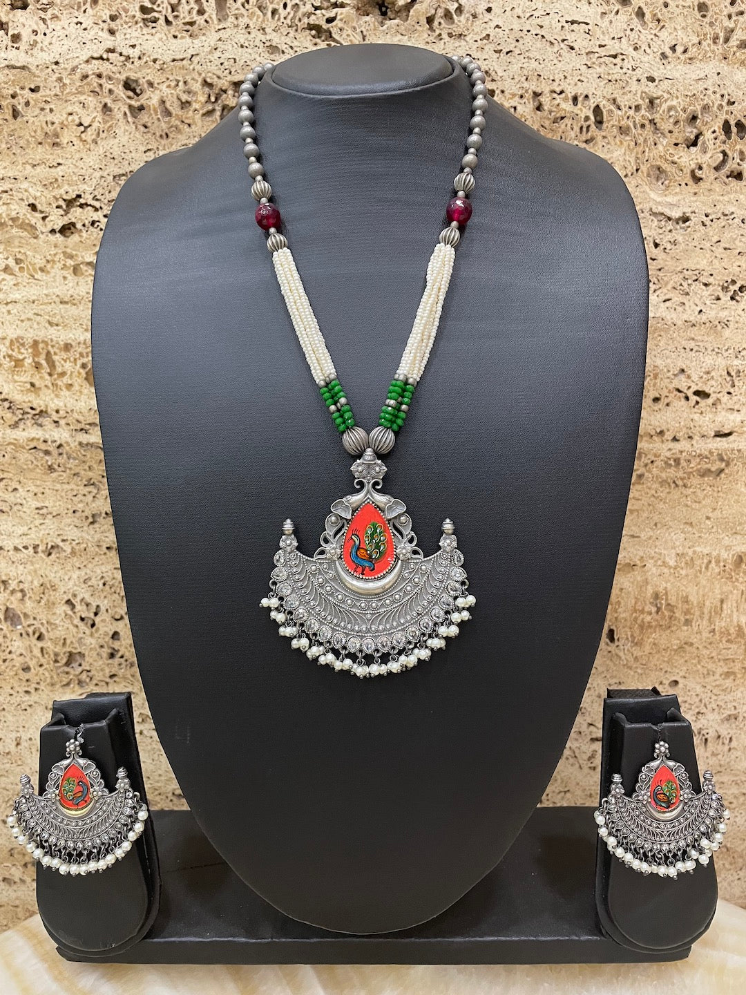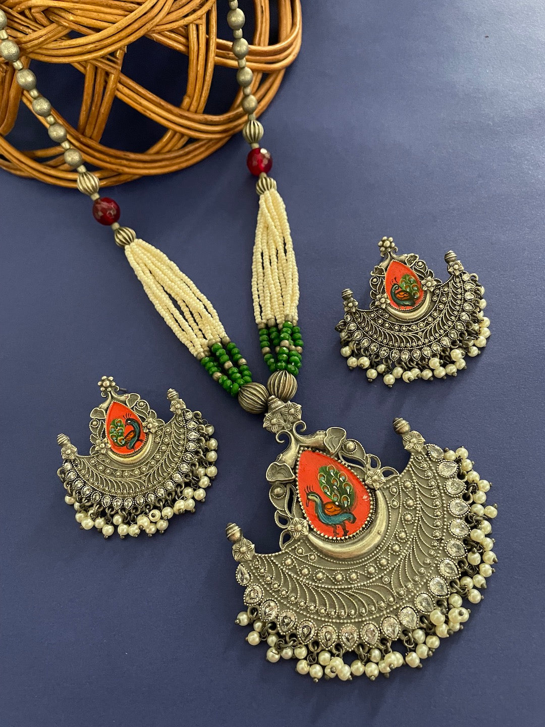 Silver Necklace Set Peacock Beads Design