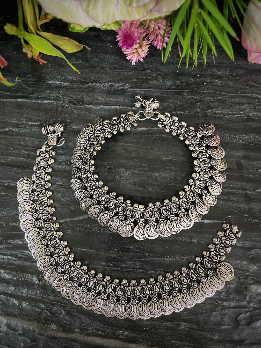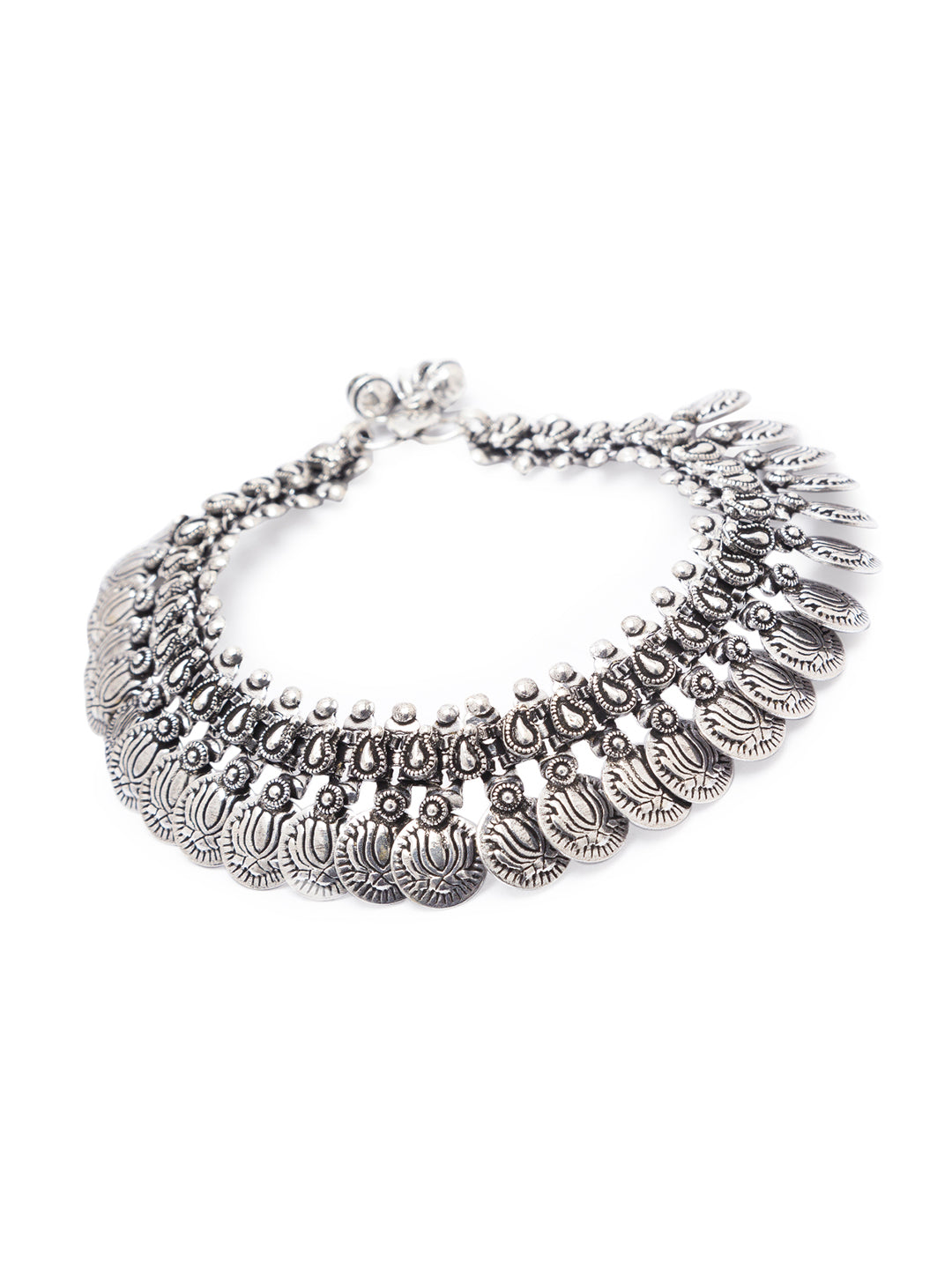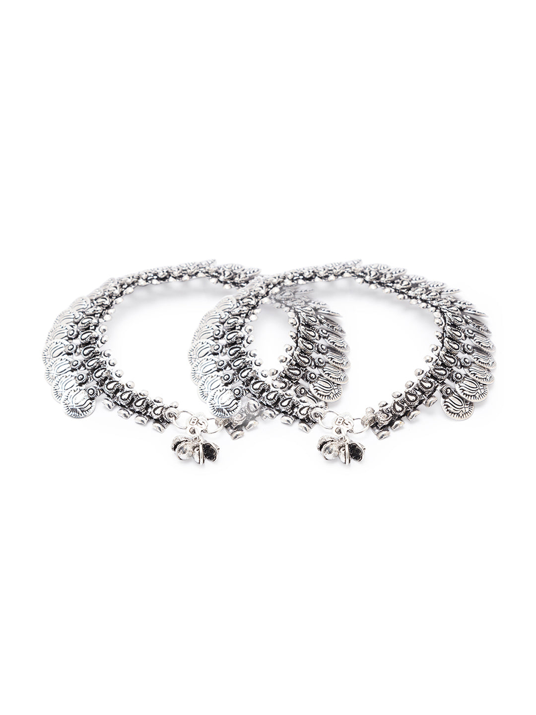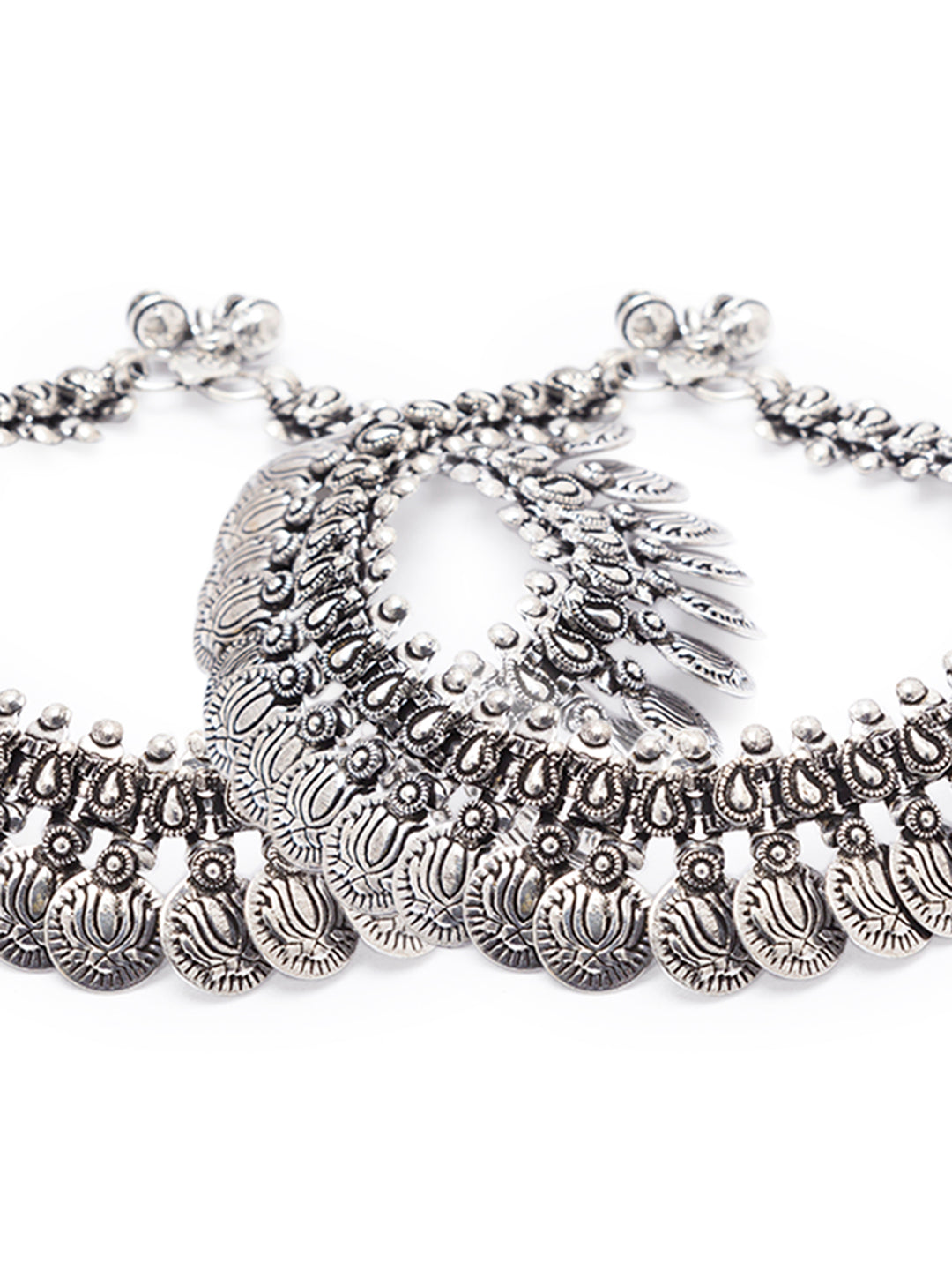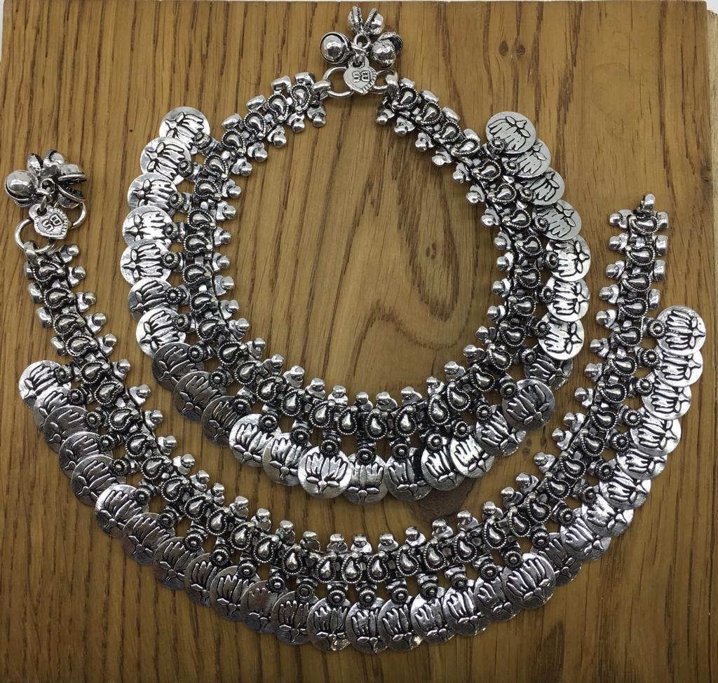 German Oxidised Silver Anklets Lotus Coin Payal Silver Plating Paijan With Ghungroo Foot Jewellery