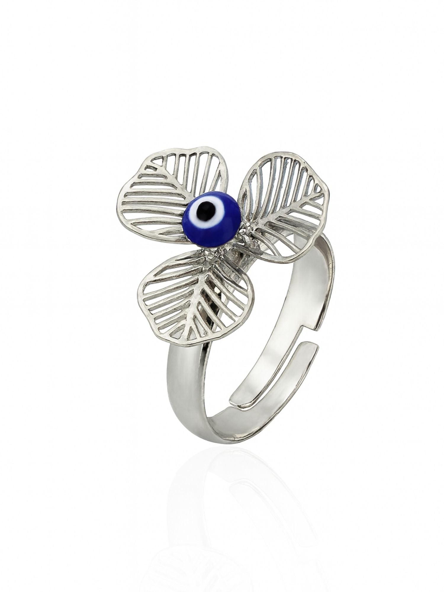Silver-Plated Clover Flower With Evil Eye Finger Ring